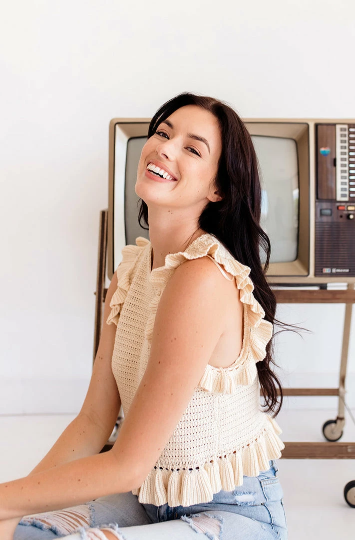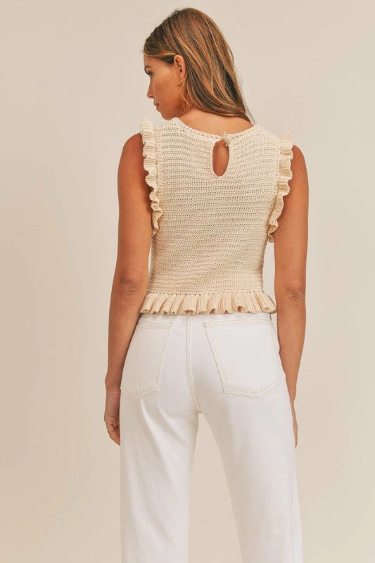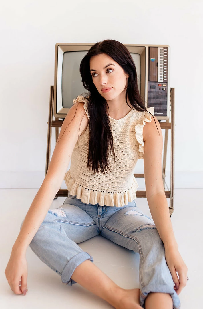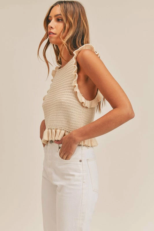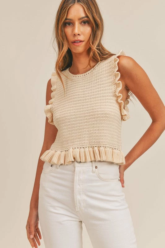 Sweet for Spring, the Marly Cotton Blend Ruffle Crop Tank in taupe features a crew neckline.