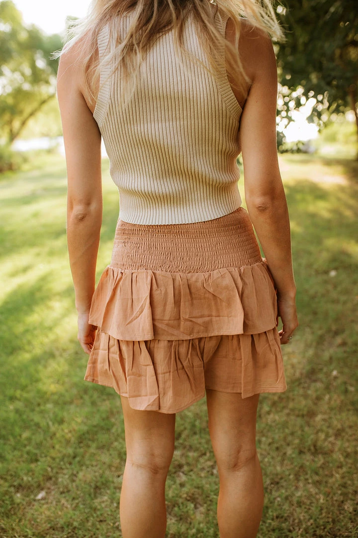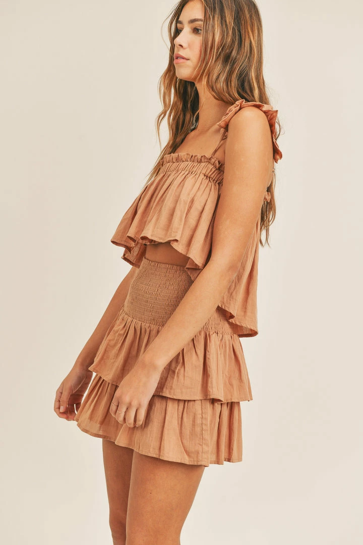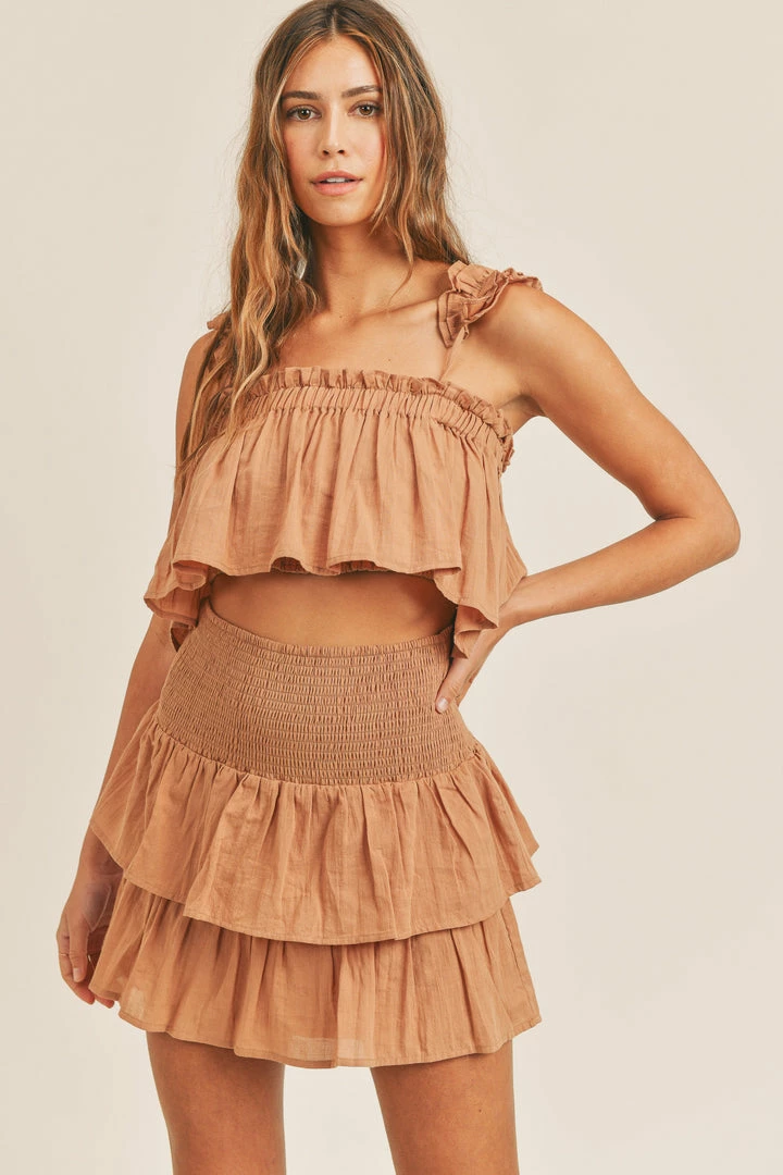This pretty set is made for summer days! Our London Smocked Ruffle Mini Skirt pairs fab with the matching top and nude heels. Finished with an elastic waist. Styled with our London Babydoll Ruffle Crop Top.