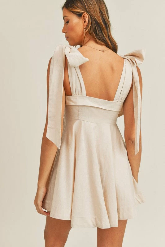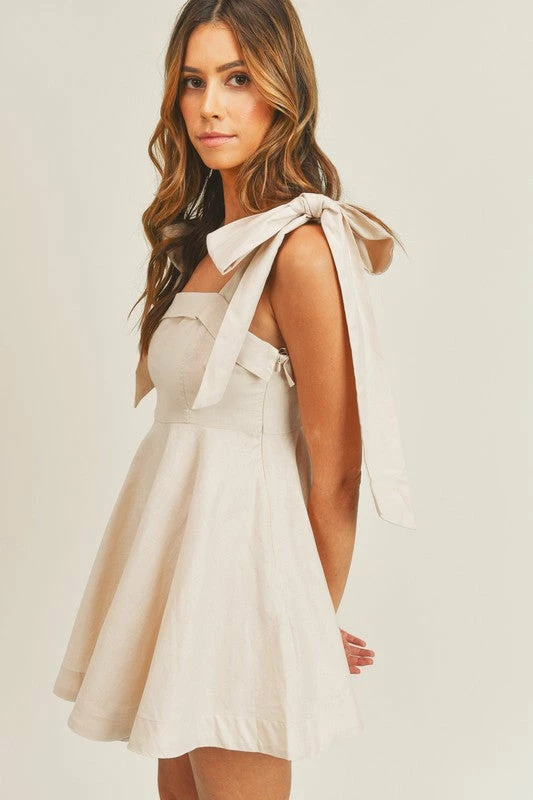 Sweetly innocent, the Ontario Cotton Linen Tie Strap Babydoll Dress in taupe features a square neckline.