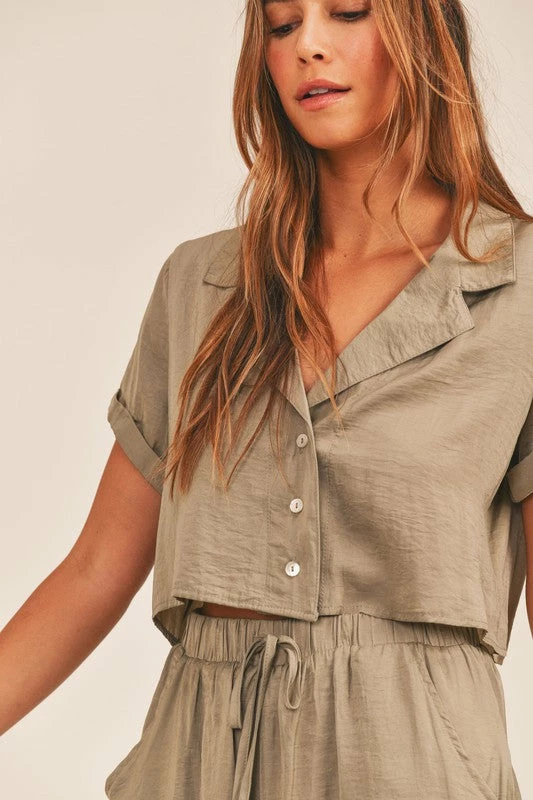 Best Seller// A silky satin set is the key to a good night sleep or Sunday brunch with the girls! Our Ressi Satin Button Down Crop Top in olive is the perfect pair to the matching shorts and slippers.