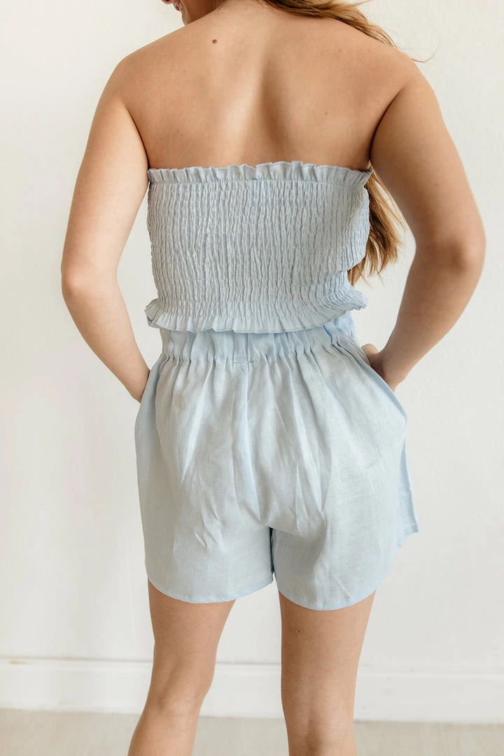 This linen set just screams summertime! Our Taylor Linen Pocketed High Rise Shorts look fabulous with the matching top and slide sandals. These blue high rise shorts have an elastic waist.