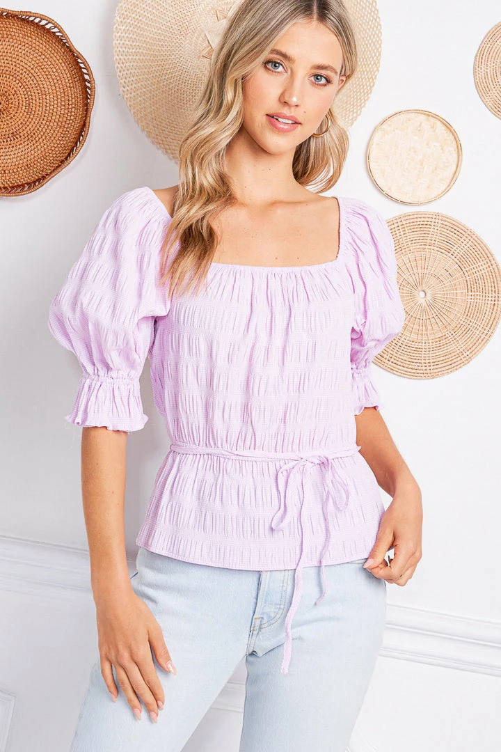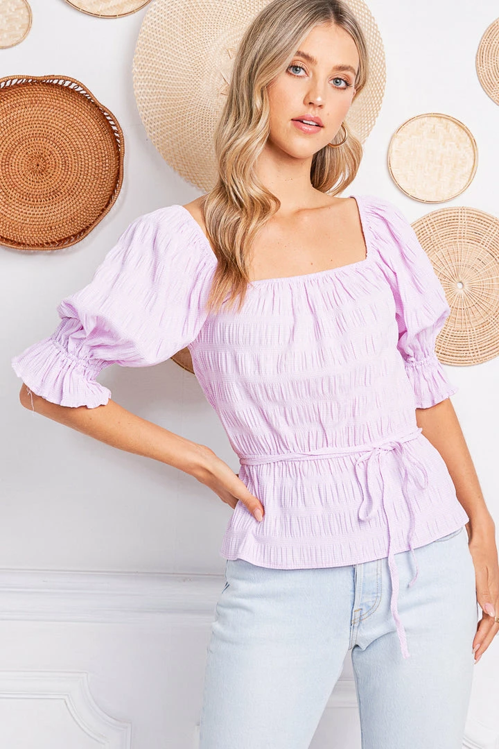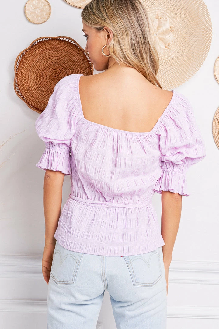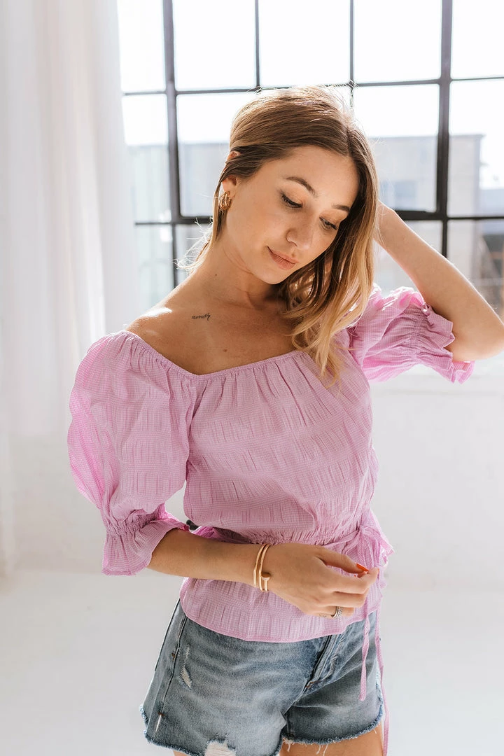 We’re in love with the Jazmine Puff Sleeve Peplum Top for it’s crinkled fabrication in pink. Designed with a square neckline with a elastic cuff sleeves. The peplum hemline is secured with a side fabric waist tie. This ultra-femme silhouette is flattering and looks beautiful with countless styling options!