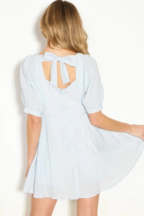 //Best Seller// Our Connolly Pocketed Puff Sleeve Dress is so effortless and easygoing! This chic blue dress is comfortably made with a crinkled base, puff sleeves, and side pockets. Easily dress yours up or down with cute sneakers or pumps! Finished with back self tie closures.