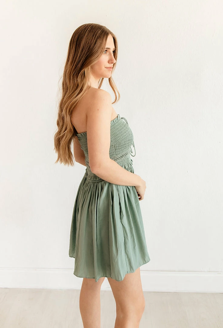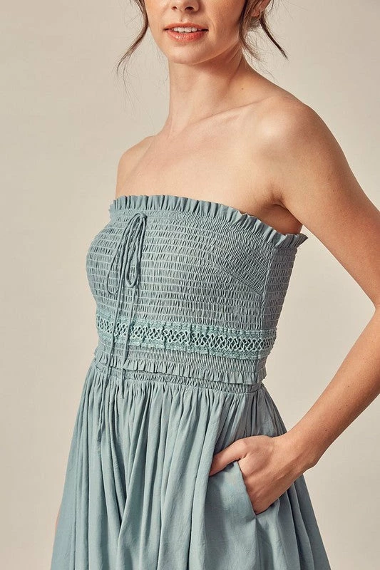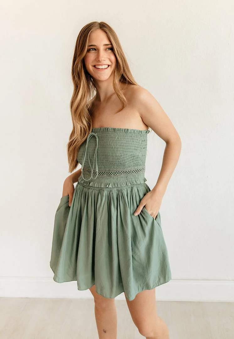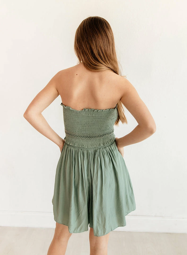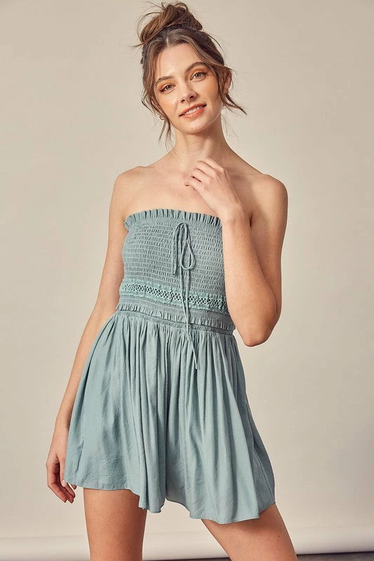 //Best Seller// Get summer ready in our Olivia Smocked Strapless Romper! Shade of sage blue are beautiful this strapless romper! We adore how the top shelf is smocked and shorts overlays add body and movement to the silhouette. The smocked elastic bodice will fit so nicely to your body and accentuate your waist. This romper look so fab styled with layered jewelry and cutout sandals!