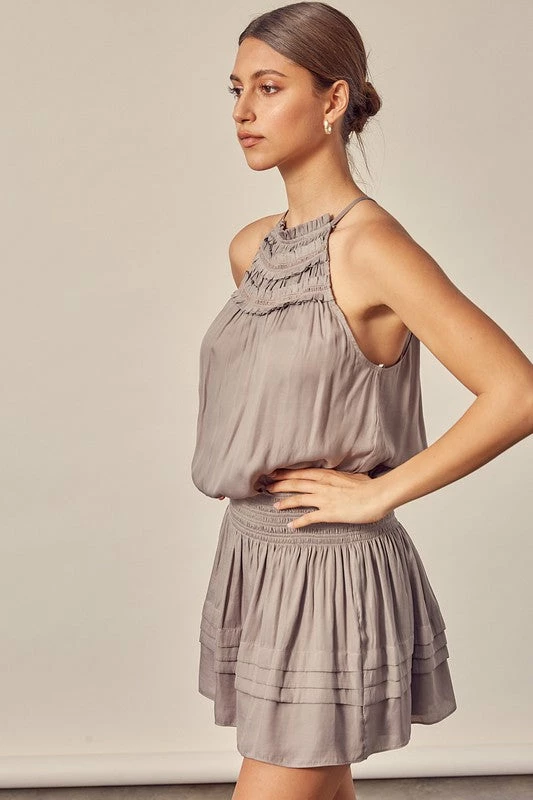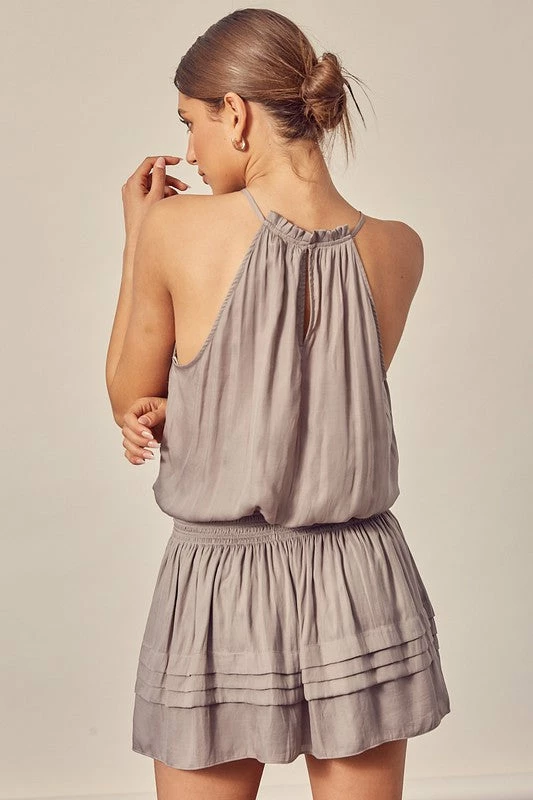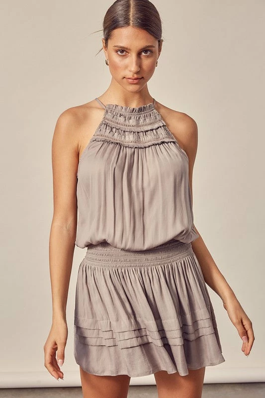 Need a dress for your next special occasion? Look no further than our Vernanda Smocked Halter Dress! This silver-olive halter mini dress has a smocked waistline and a ruffle detail skirt.