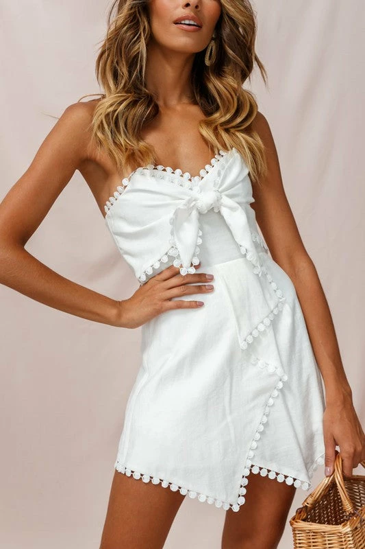 We’re floating away in the Perfect Match Pom Pom Wrap Romper! This super cute doll features a white strapless sweetheart silhouette. Structured with boning throughout the bust area and daintily covered with an adjustable front tie. Crochet trim decorates the edges of the romper. Fit with a draped front skirt overlay. A perfect piece for a summer day date!