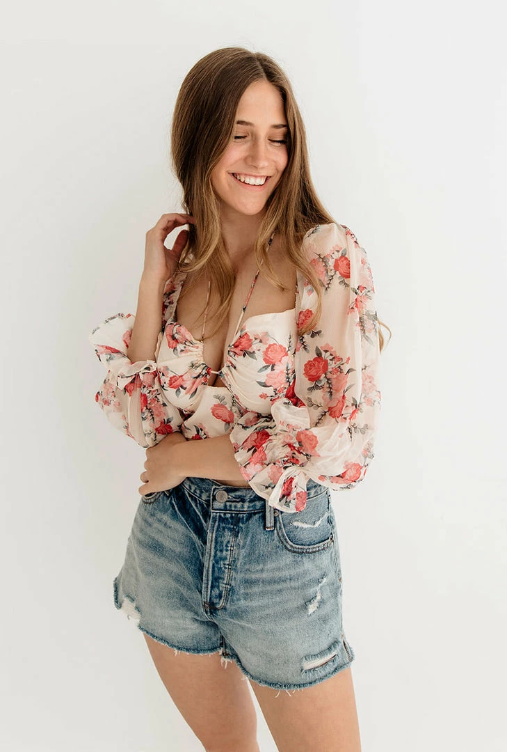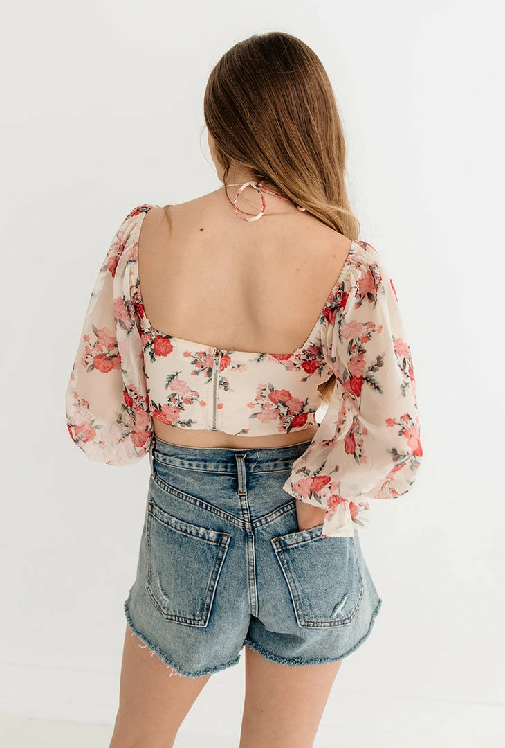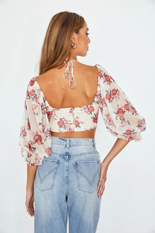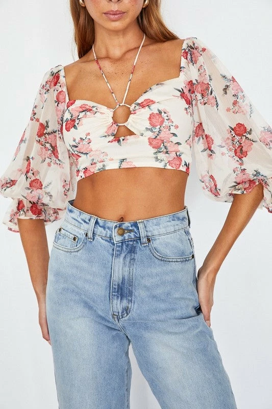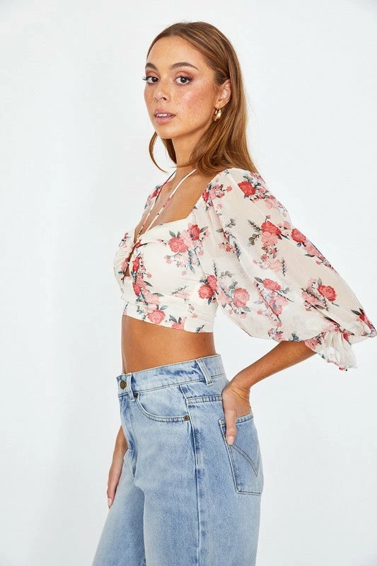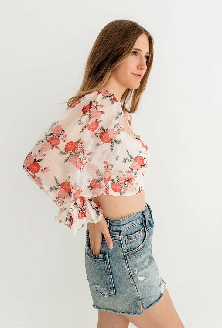 Our Coming Up Roses Tie Floral Crop Top Blouse is summer ready! Florals in red, pink, and green lay across the beige base of this beauty. Designed with an adjustable neck tie closure, smocked back and ruffle cuffs.