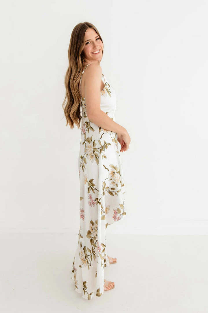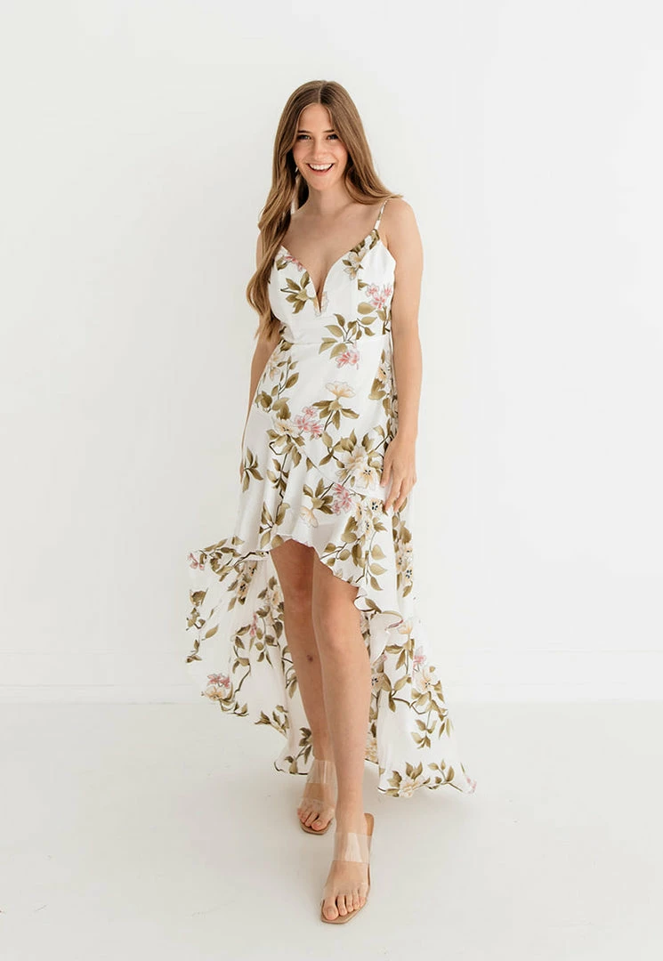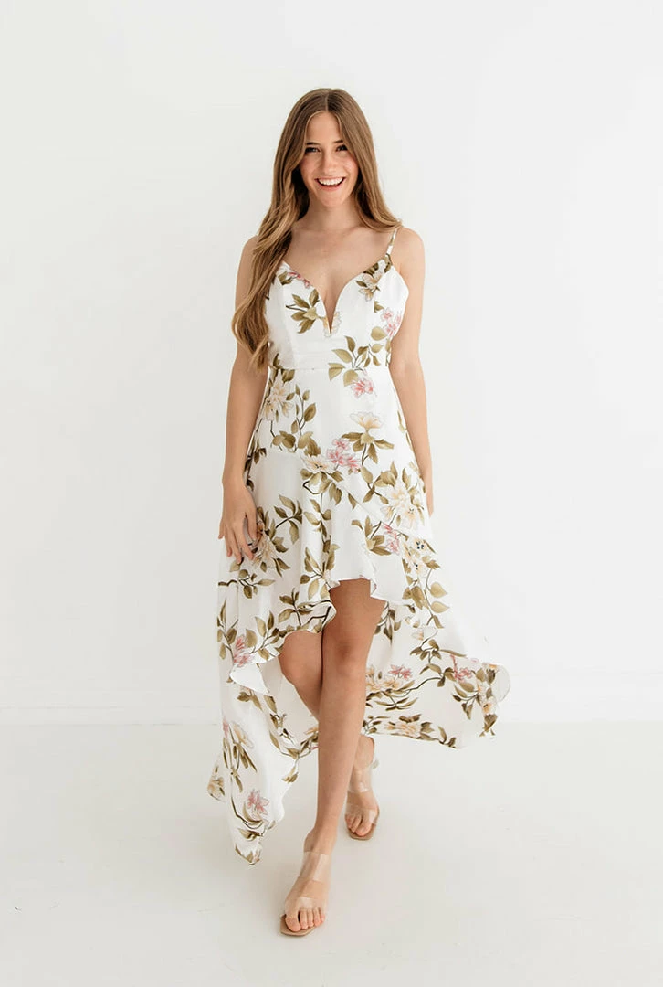 Turn heads as a guest of the wedding in our Kelly Floral High Low Ruffle Maxi Dress! This stunning maxi dress has a wired v-neck neckline and a high low ruffle wrap hem. A white base with florals in green, pink, yellow, and white.