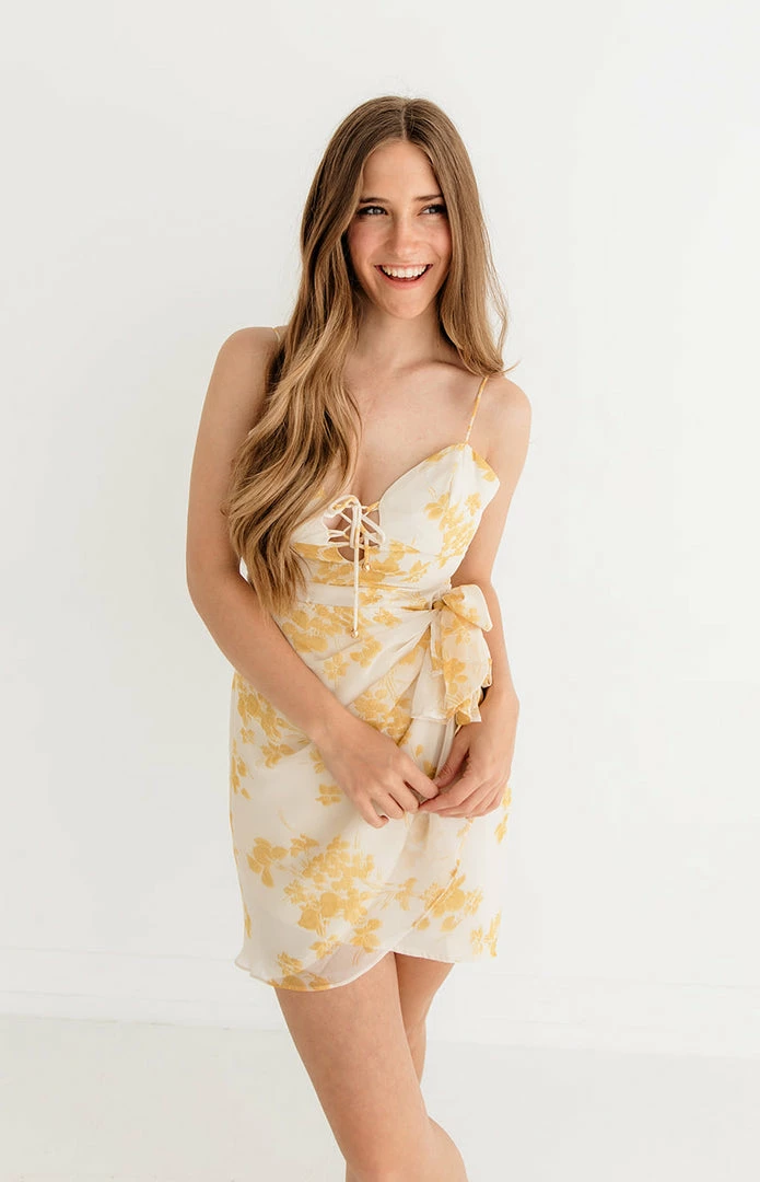 //Best Seller// We cannot get enough of our My Honey Lace Up Wrap Mini Dress! The neutral base, and floral print set the perfect tone for this adorable sundress! We love this dress that features adjustable spaghetti straps and an apron style front wrap detail.