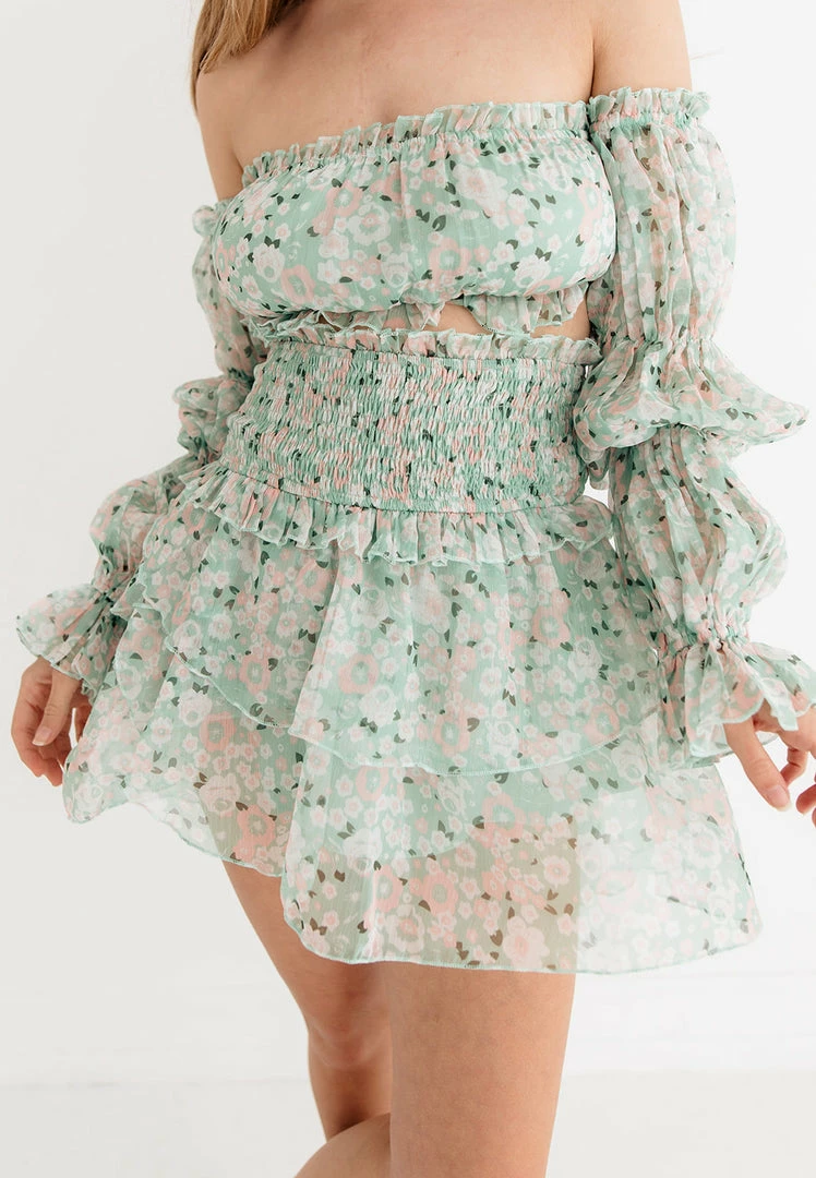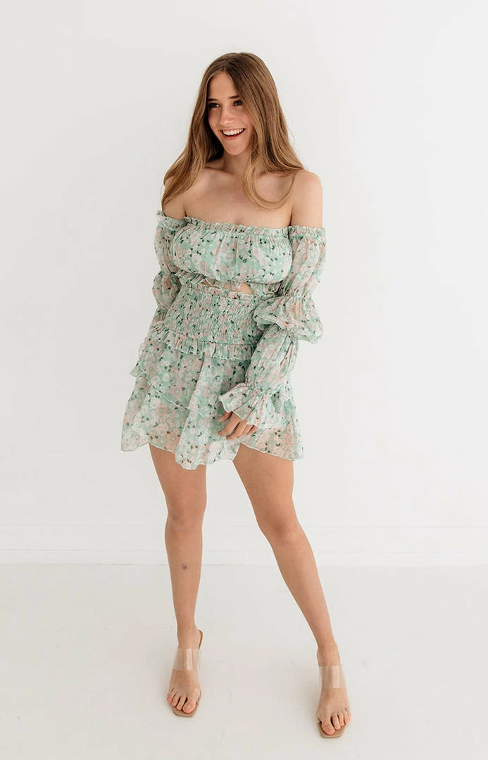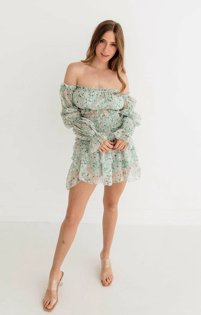 We adore the girly vibes of this floral printed set! Our Paxton Floral Ruffle Crop Top looks best with the matching skirt and nude or white heels. This mint floral top features a elastic neckline & puffy sleeves.