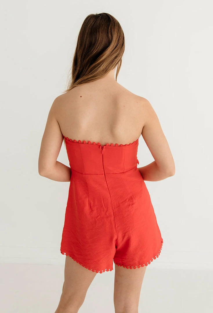 We’re floating away in the Perfect Match Pom Pom Wrap Romper! This super cute doll features a white strapless sweetheart silhouette. Structured with boning throughout the bust area and daintily covered with an adjustable front tie. Crochet trim decorates the edges of the romper. Fit with a draped front skirt overlay. A perfect piece for a summer day date!