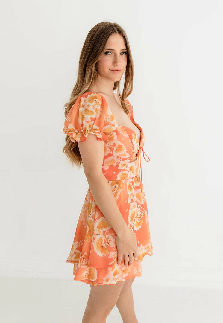 Blossom in this beautiful floral romper! Our Robin Floral Cutout Tiered Romper comes in a luscious orange base with florals in ivory and orange. This iconic piece has a sweetheart tie neck and cutouts with floral print throughout.