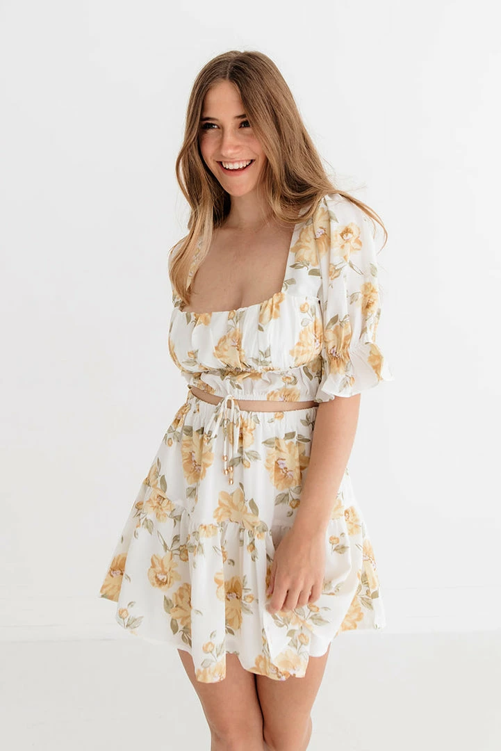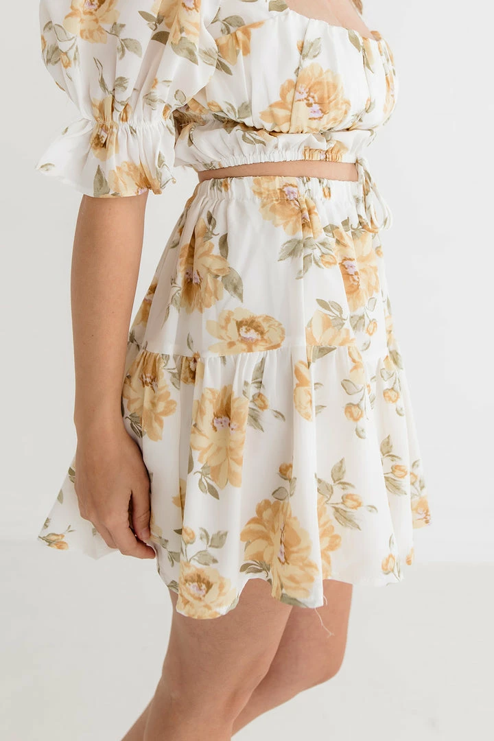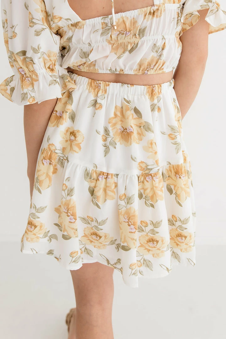 Best Seller// Keep it fun and flirty in the Willow Ruffle Tiered Mini Skirt! Designed with a white base detailed with yellow & green florals. Fit with an elastic ruffle waistband and tiered ruffle skirt. It’s breezy and perfect for summer! Paired with our Willow Floral Crop Top.
