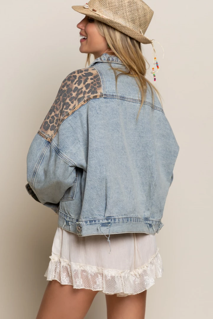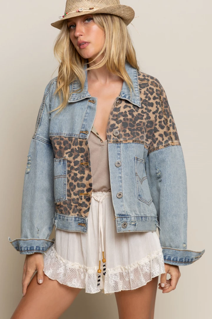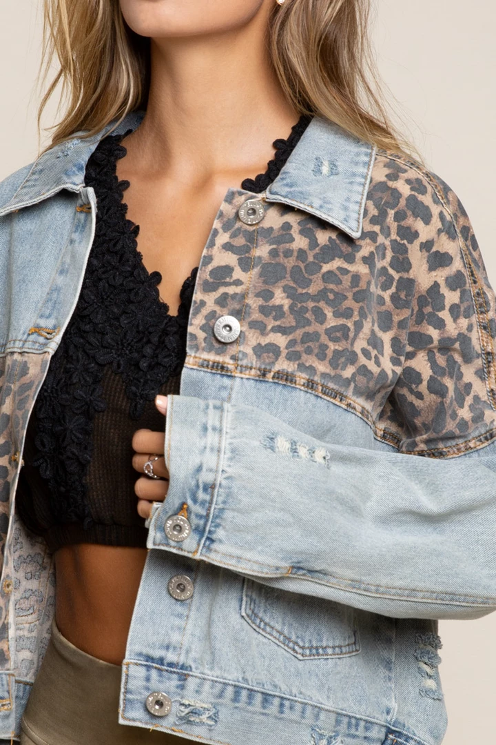 – DENIM JACKET WITH CHEETAH PANELS AND DISTRESS