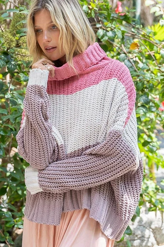Our Gabi Color Block Chenille Sweater is a true Fall vibe! This stretchy knit fits oversized with long sleeves and major turtleneck appeal. Designed in a thick and cozy knit body with color blocked stripes in hot pink, cream & dusty rose. Pair it along with jeggings and suede booties for the season.