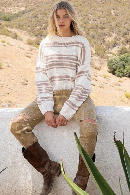 Our Pippa Striped Chenille Sweater is classically comfy! This cream & beige striped knit sweater features a wide neckline and dropped shoulders. Finished with ribbed edges.