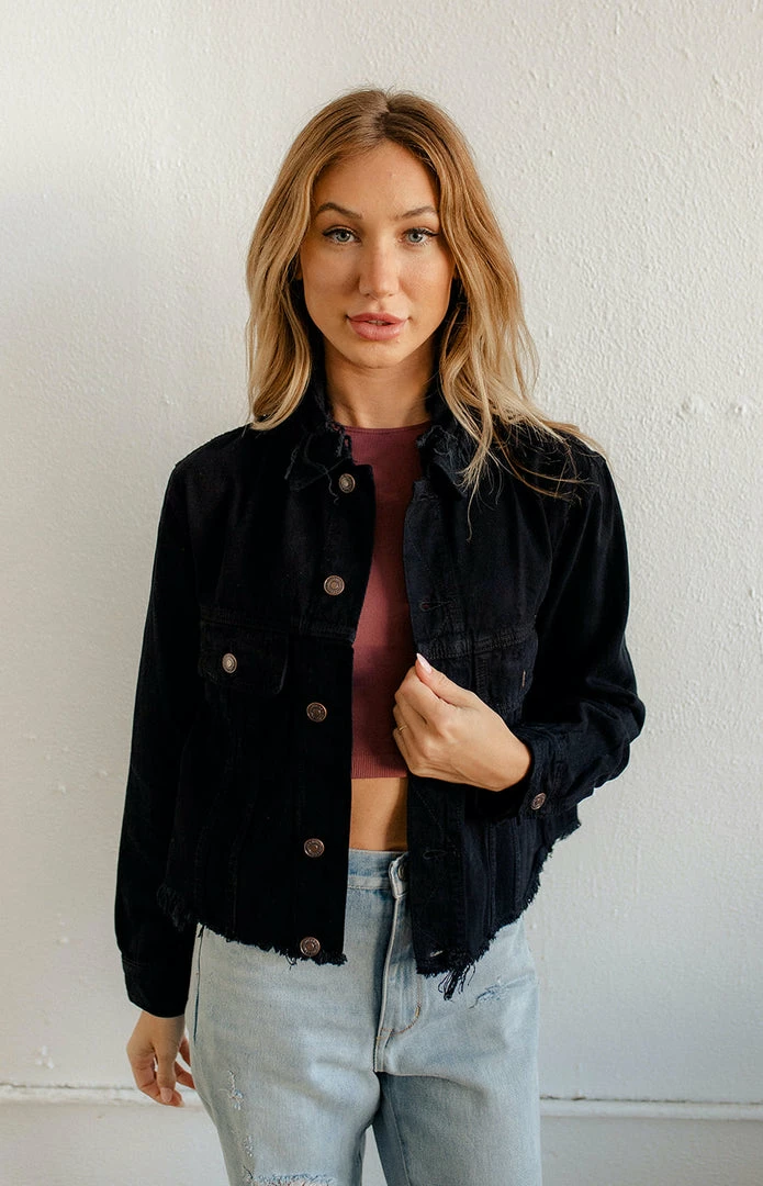 Every wardrobe should have our Encore Cotton Frayed Denim Jacket! This essential features a black fabrication on a non-stretch fit. Constructed with two chest, side pockets and cuffed long sleeves. A distressed frayed hemline takes the look up a notch!