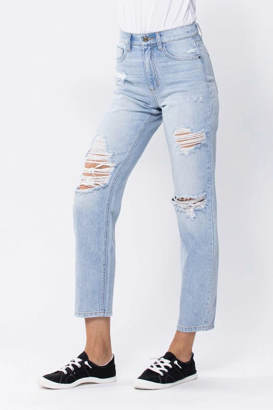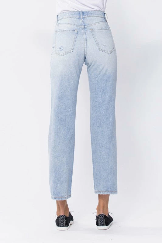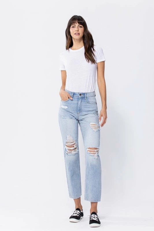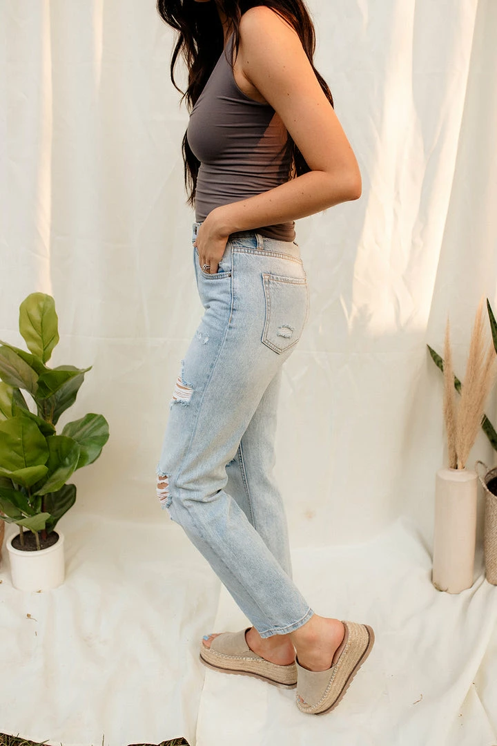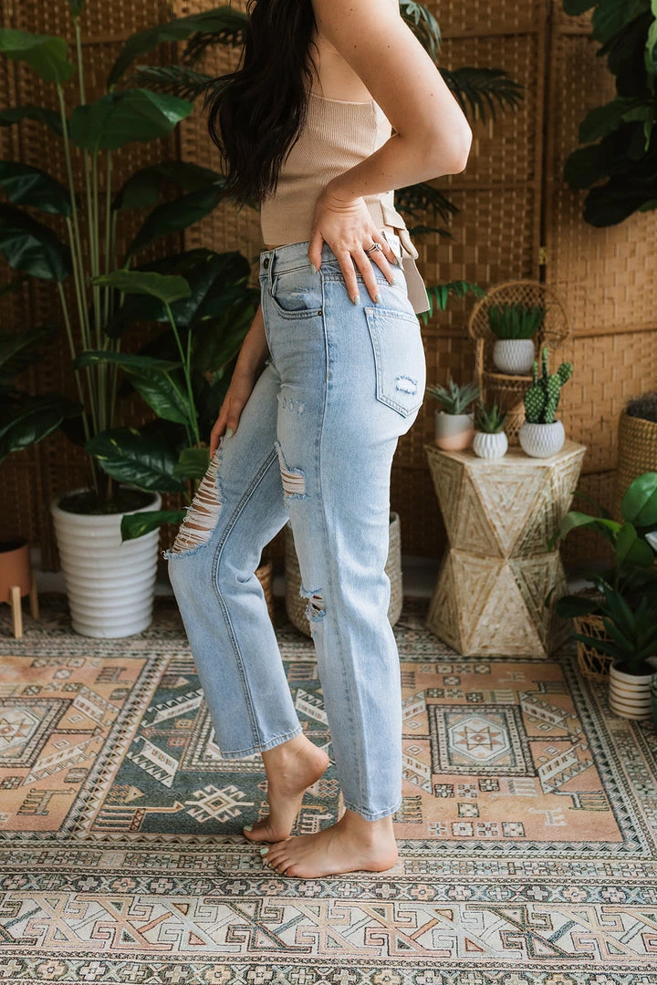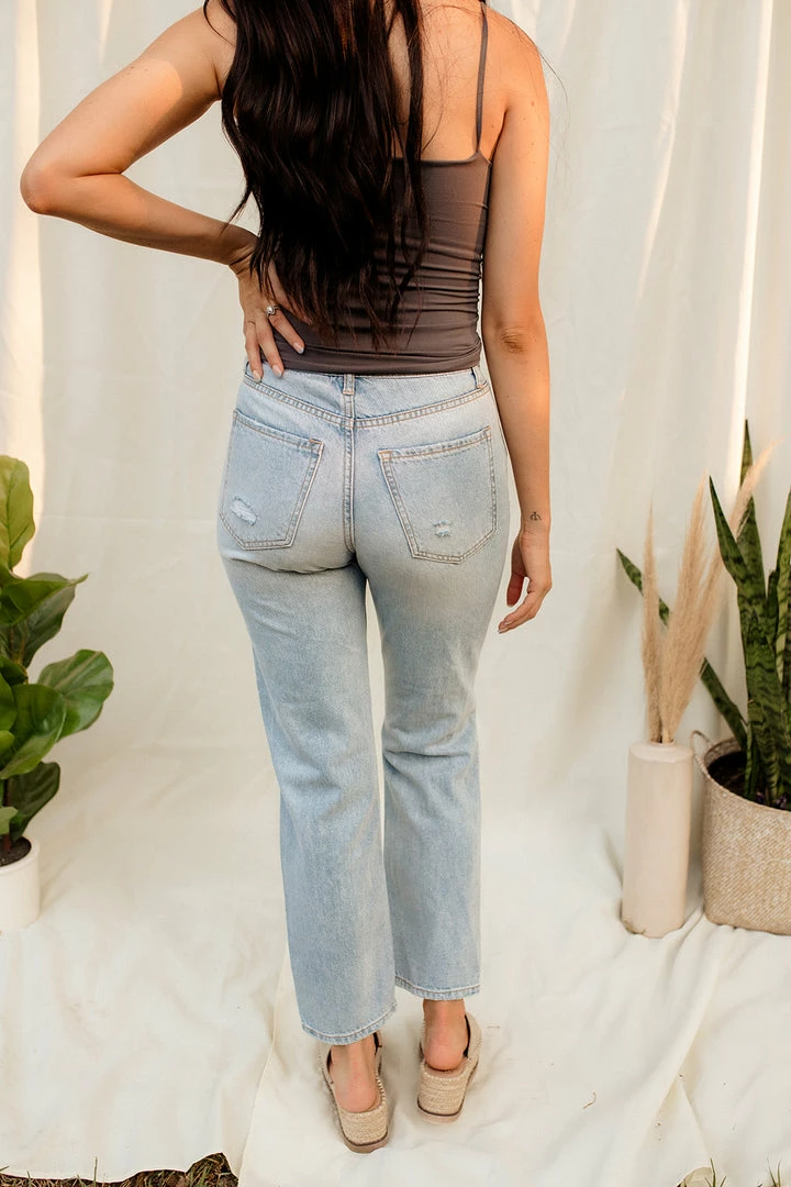 Our Bailey High Rise Distressed Denim Jeans are super flattering! These light wash jeans have no stretch and a frayed distressed details. Finished with a classic 5 pocket and a front fly and zipper button closure.