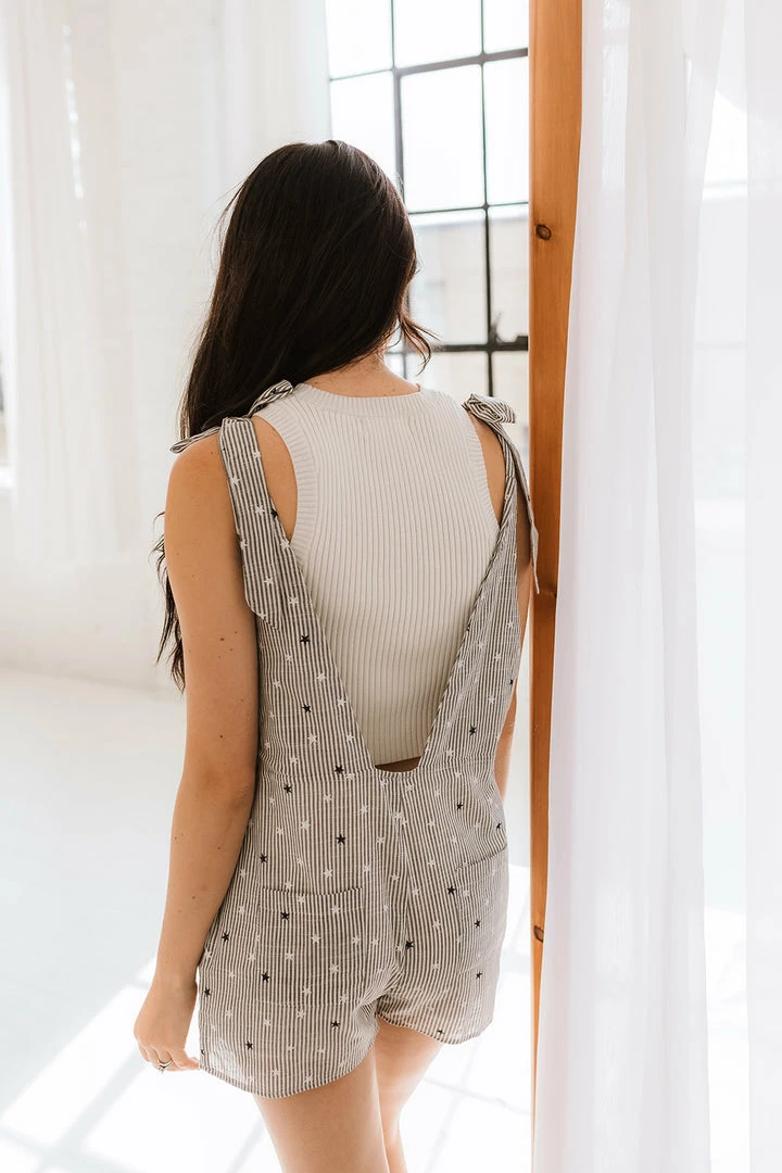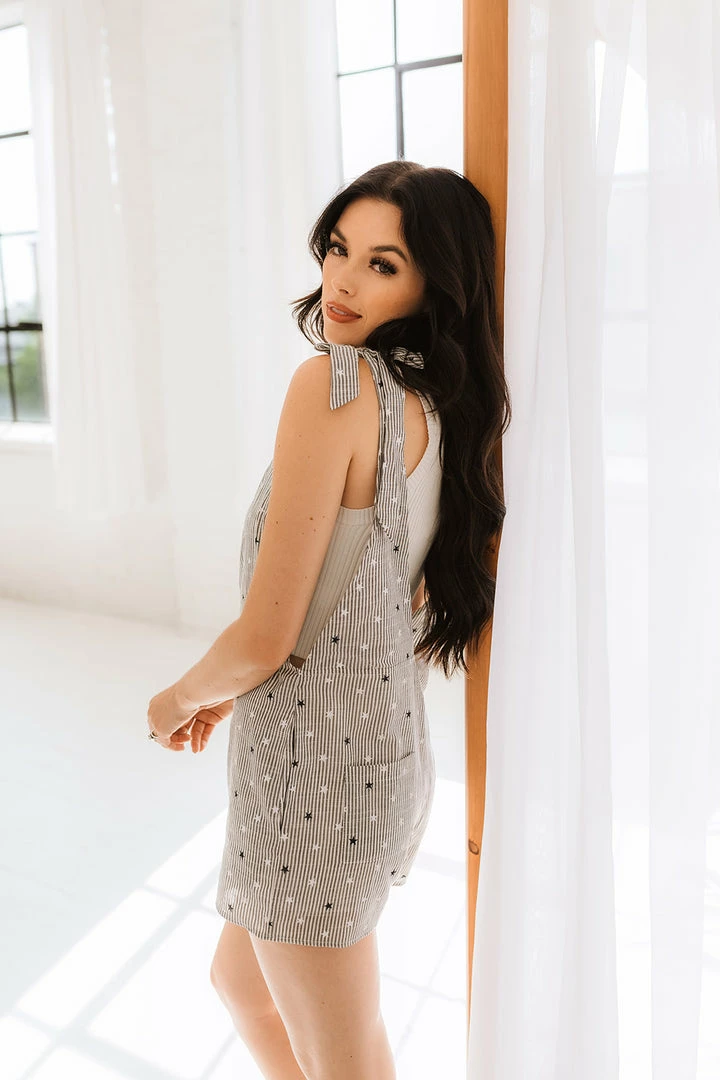 Star embroidered everything please! Our All Star Pin Striped Overall Romper is a grey base with delicate ivory & navy embroidered stars. Finished with side pockets, self tie overall straps, and an invisible zipper back closure.