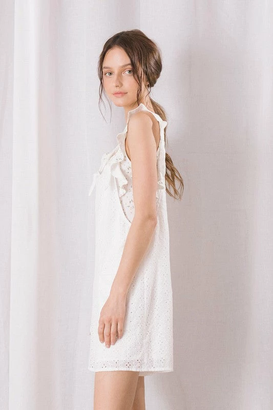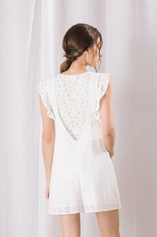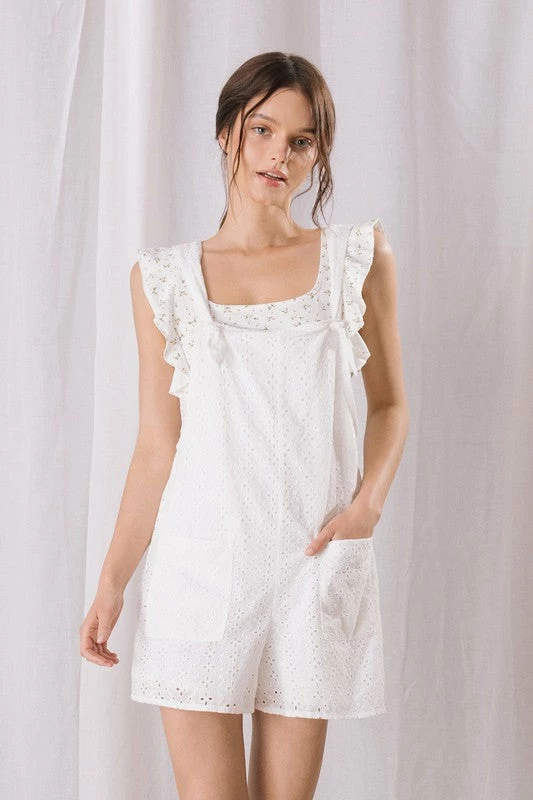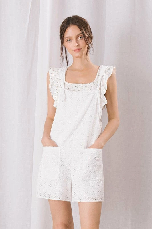 Our Dani Eyelet Pocketed Overall Romper feels barely there! This white one piece is finished with front pockets and eyelet fabrication.