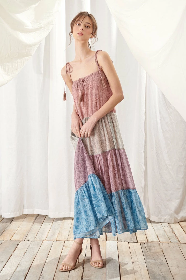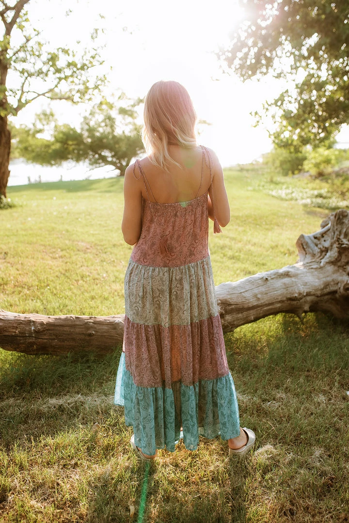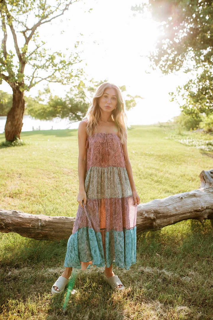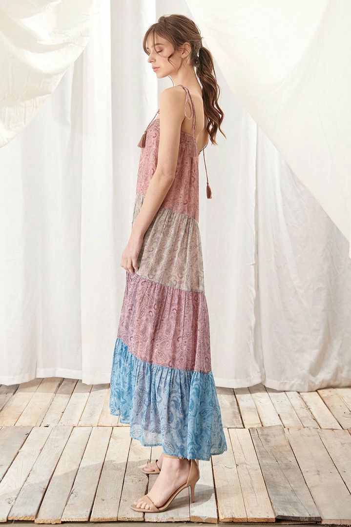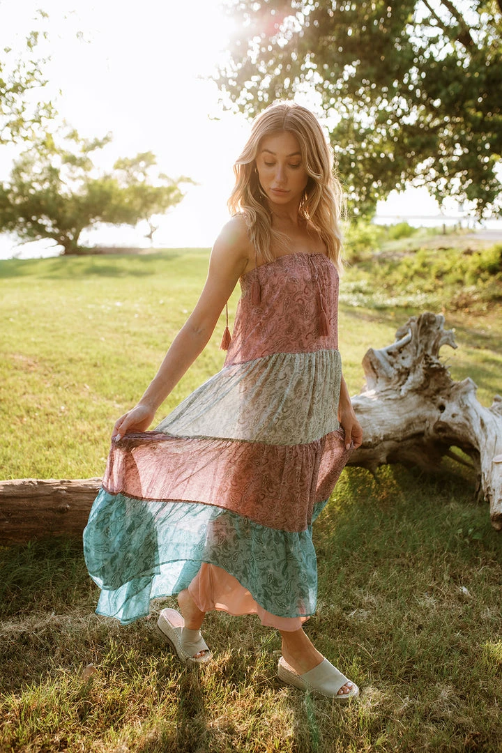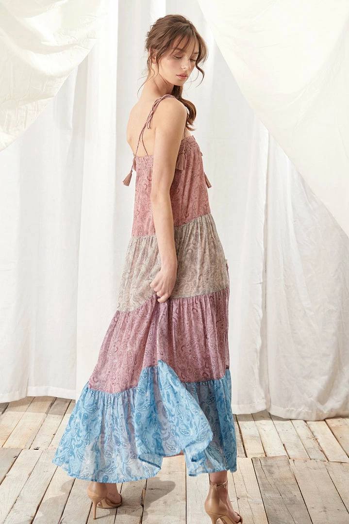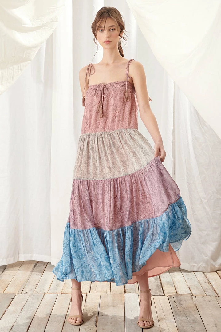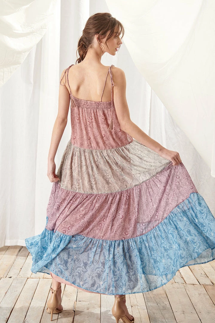 You’ll never want to take off our Capriccio Paisley Tiered Maxi Dress! This paisley dress is detailed with mauve, taupe, and blue colors. Finished with a elastic square neckline and adjustable tassel tie straps.
