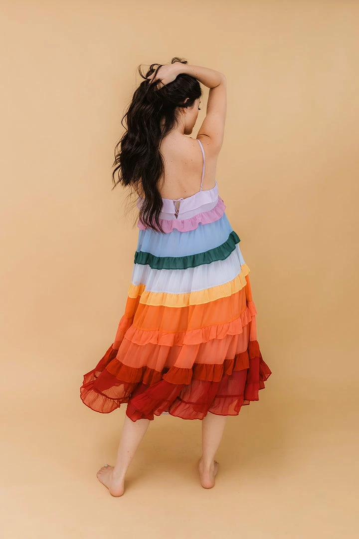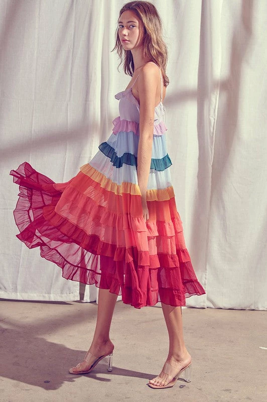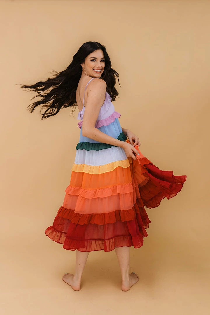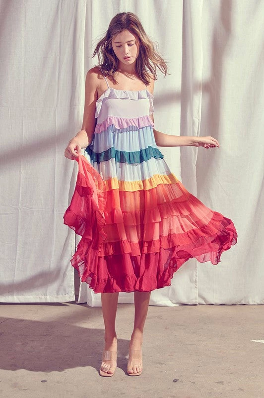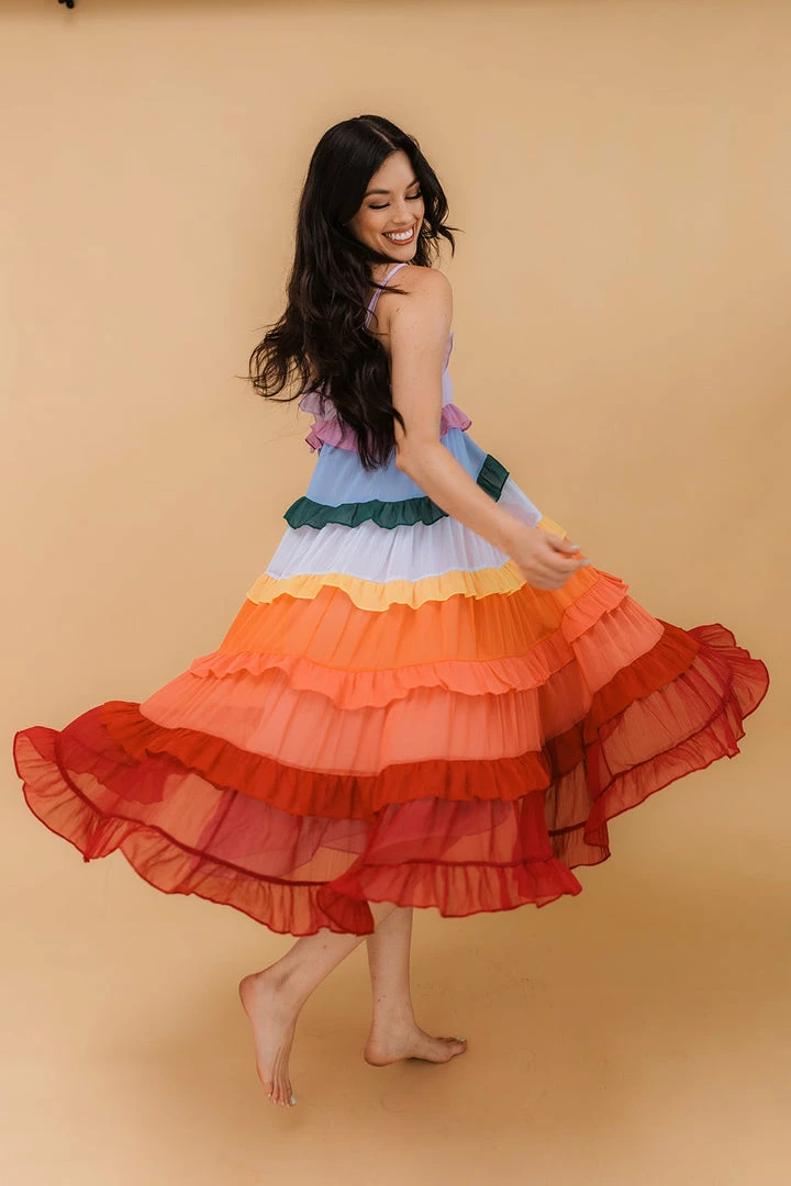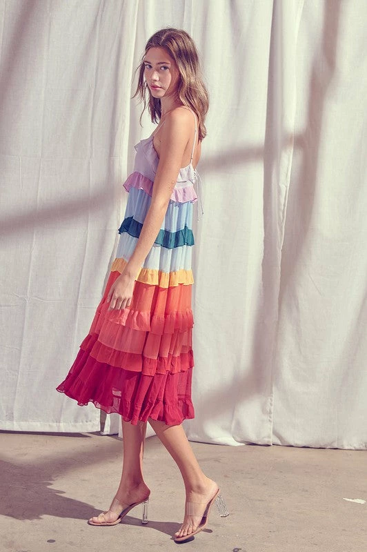 Our Color Me Pretty Ruffle Tiered Midi Dress sits pretty with crinkled chiffon tiers in lavender, purple, blue, hunter green, light blue, yellow, orange, coral, red and burgundy. Resting daintily with adjustable straps and flowy skirt. Feel effortlessly femme as you toast the day away! Finished with a full lining.