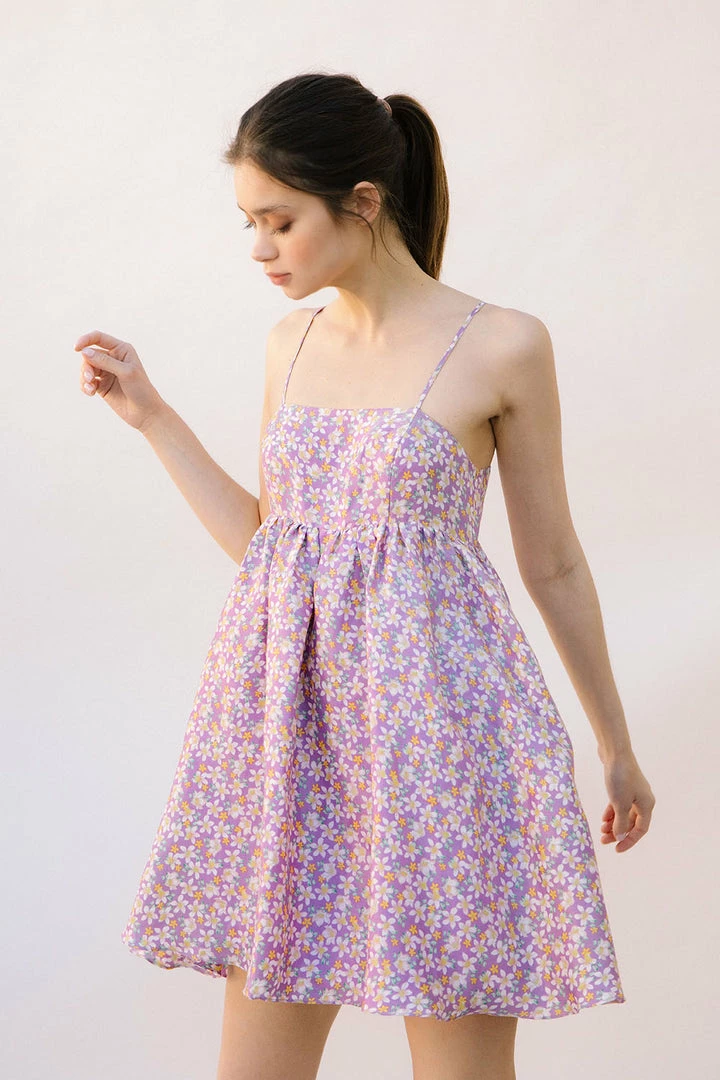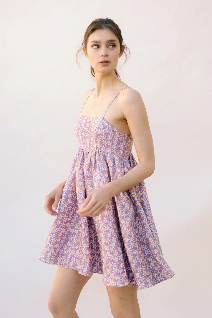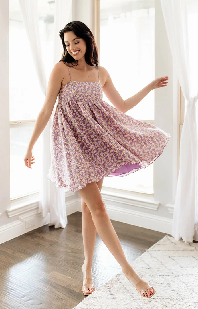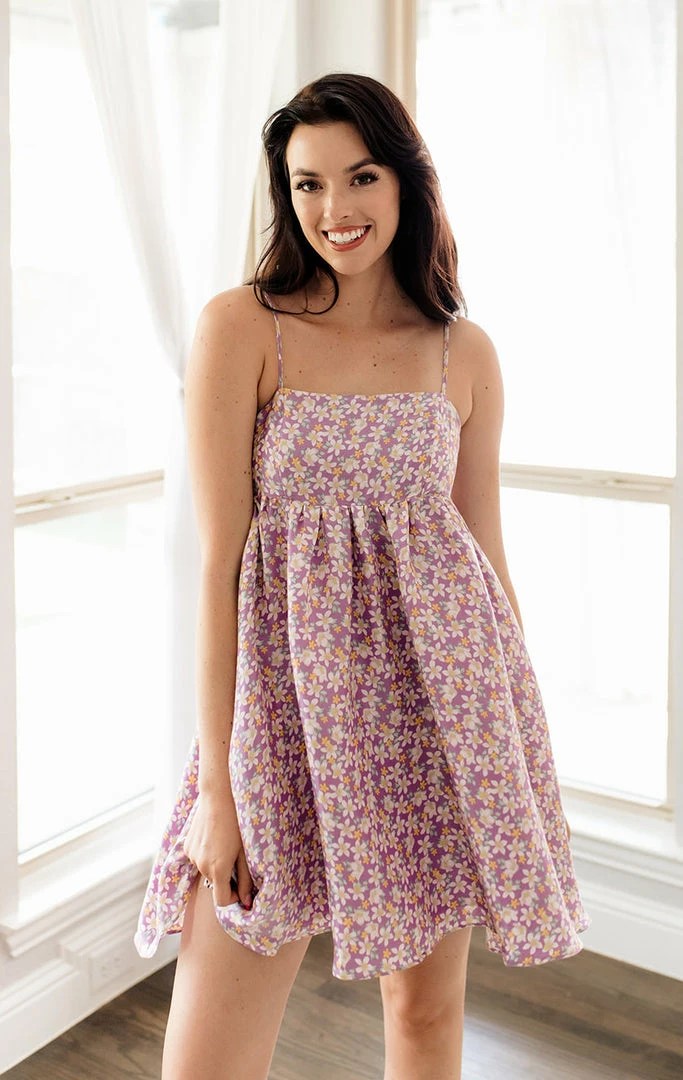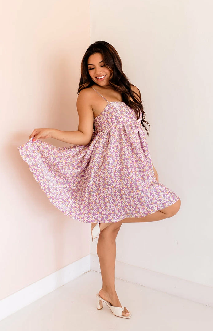 //Best Seller// Our Joan Floral High Sheen Babydoll Dress comes in the cutest print! This purple base with white, mustard, yellow & green floral high sheen dress has adjustable straps and a concealed back zip closure.