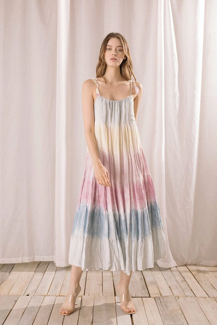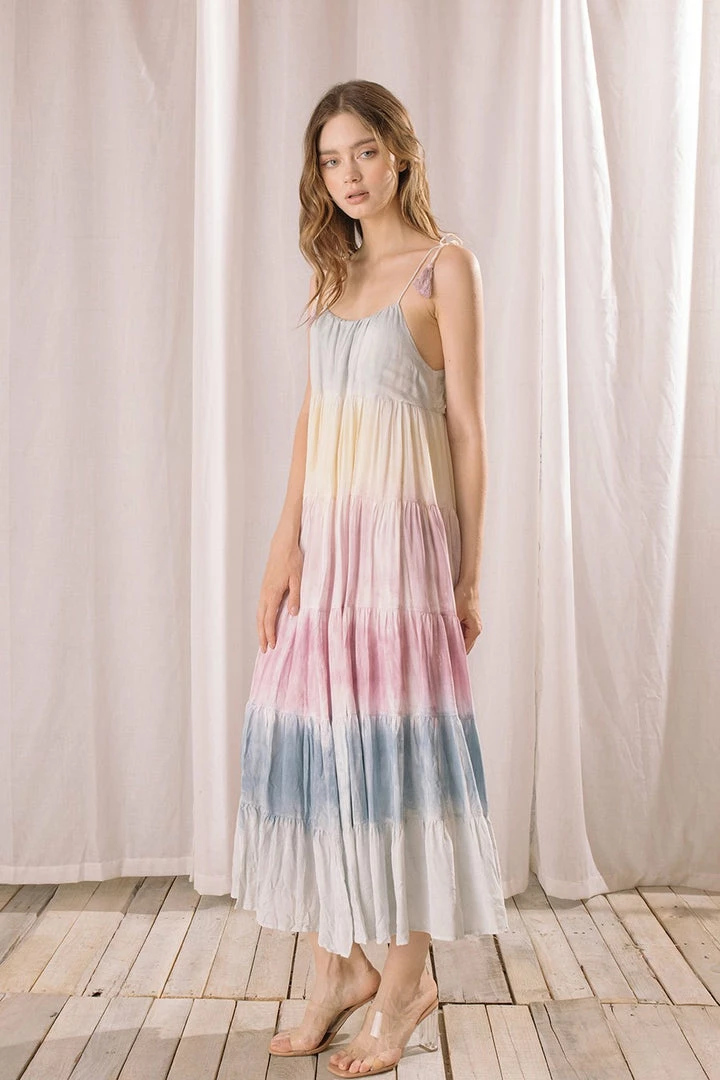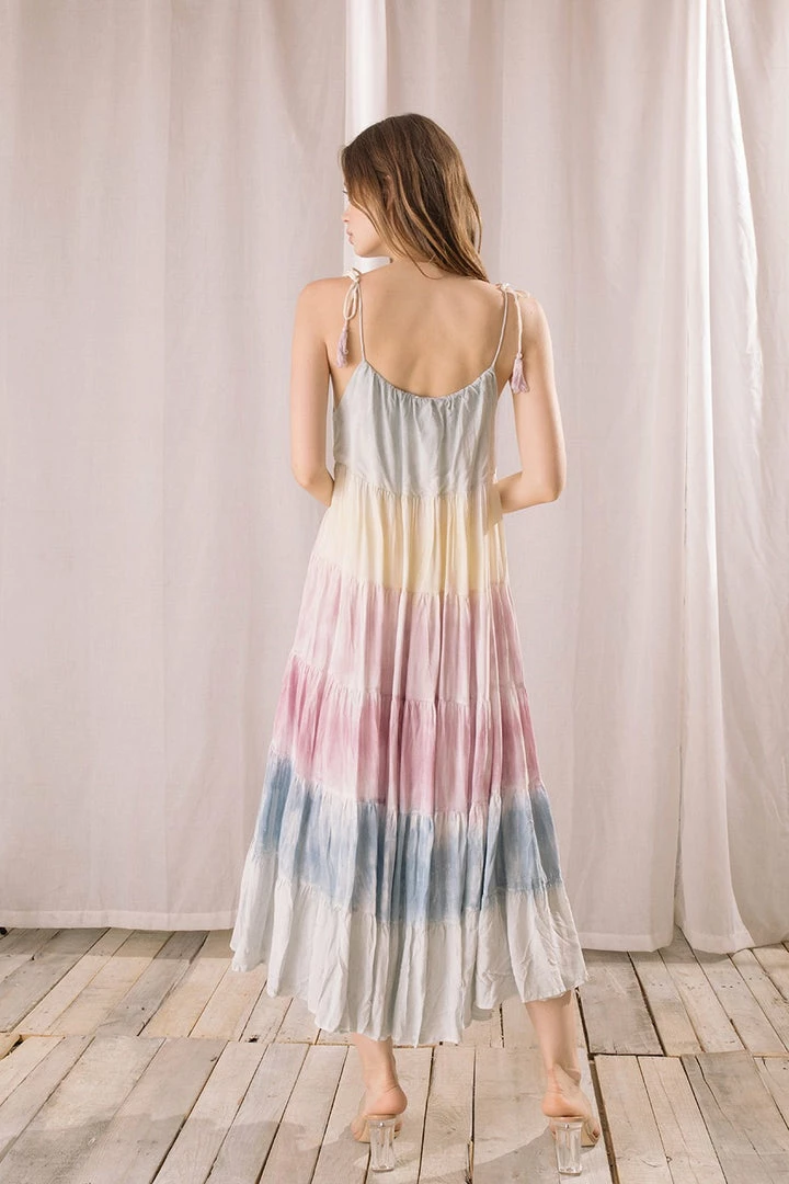 Your resort dinner ‘fit is right here! Our Sunset Tie Dye Color Block Maxi Dress comes in silver, yellow, green, blue, and grey tie dye with a tiered silhouette. This long dress has spaghetti straps and sewn tassel ties.