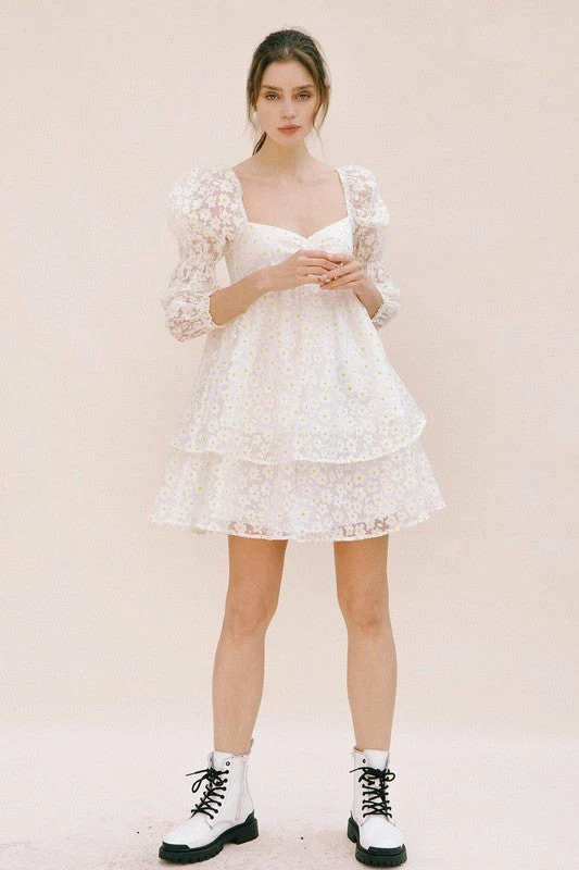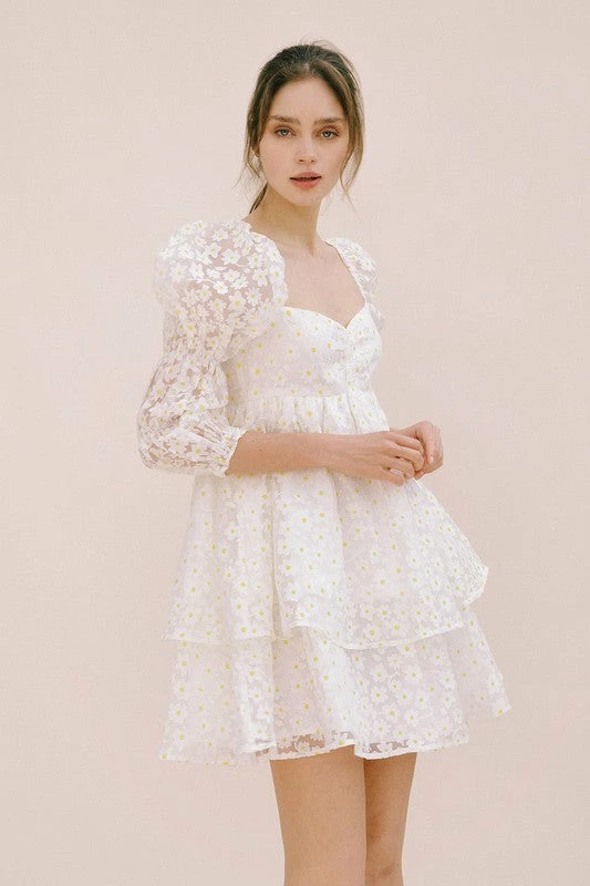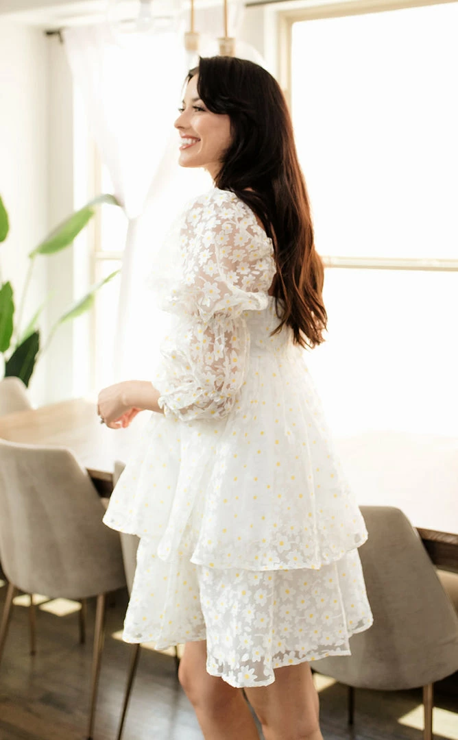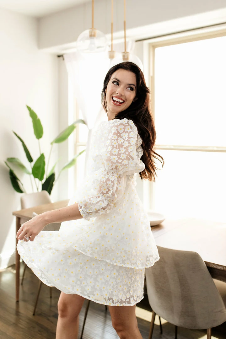 //Best Seller// Our Marly Daisy Applique Floral Babydoll Dress comes in the cutest print! This white daisy floral high sheen dress has puff sleeves and a concealed back zip closure. The embroidered daisy give it that much detail!
