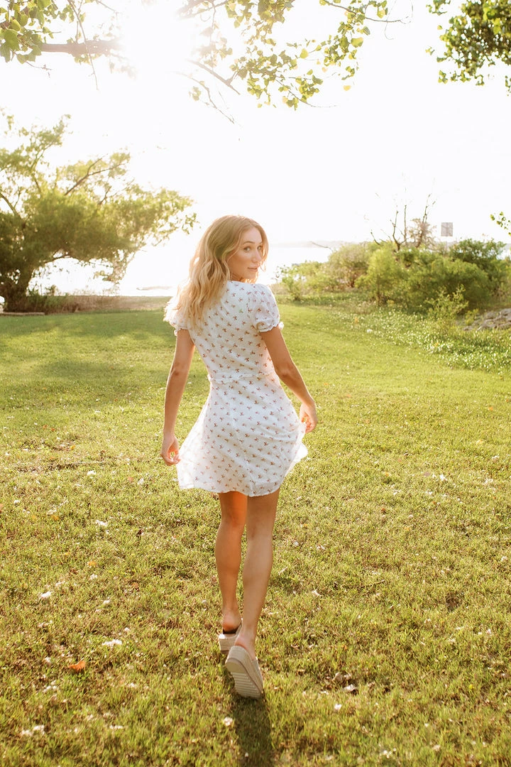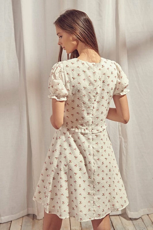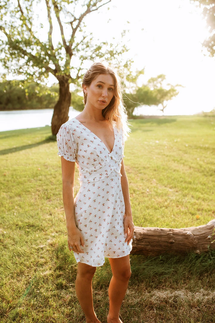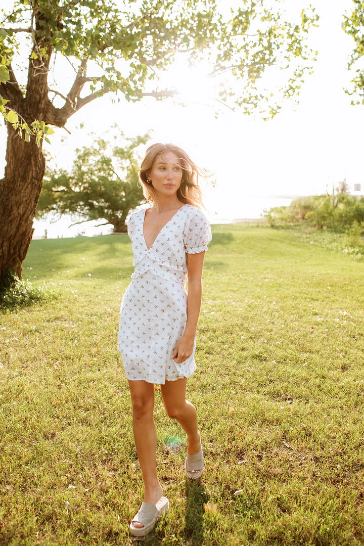 We adore the girly vibes of our Quince Swiss Dot Floral Button Down Dress! This white floral mini is detailed with a ruffle trim and button down details. Finished with a puffy elastic sleeves and a v-neckline.