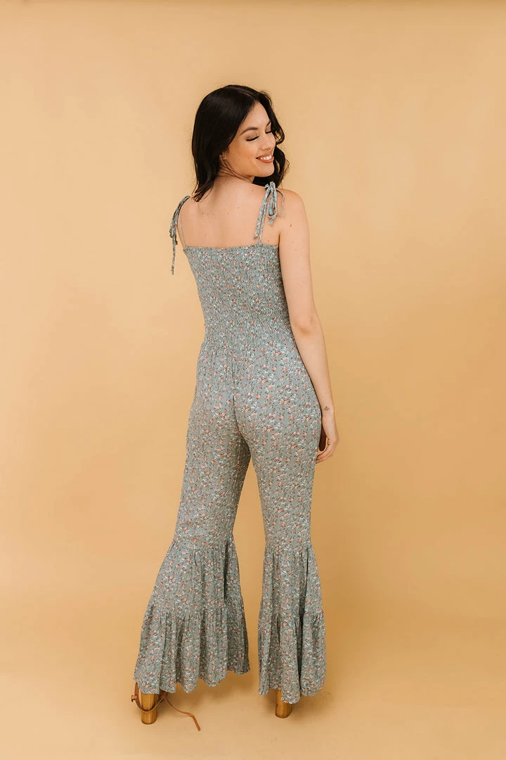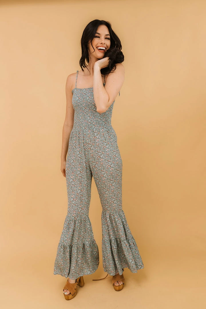 //Best Selling Silhouette// Our Lucie Floral Smocked Flared Leg Jumpsuit is photoshoot ready! White, orange & brown florals decorate the green/sage. Finished with a square neckline and a flared pant leg.