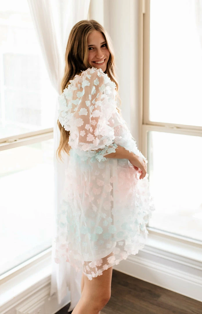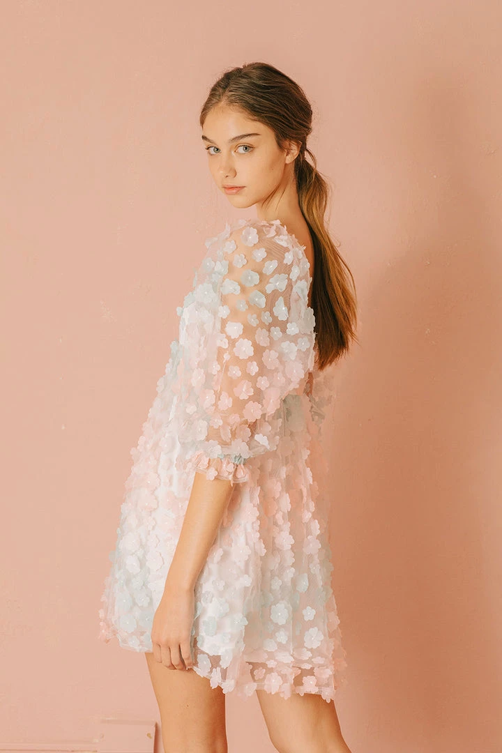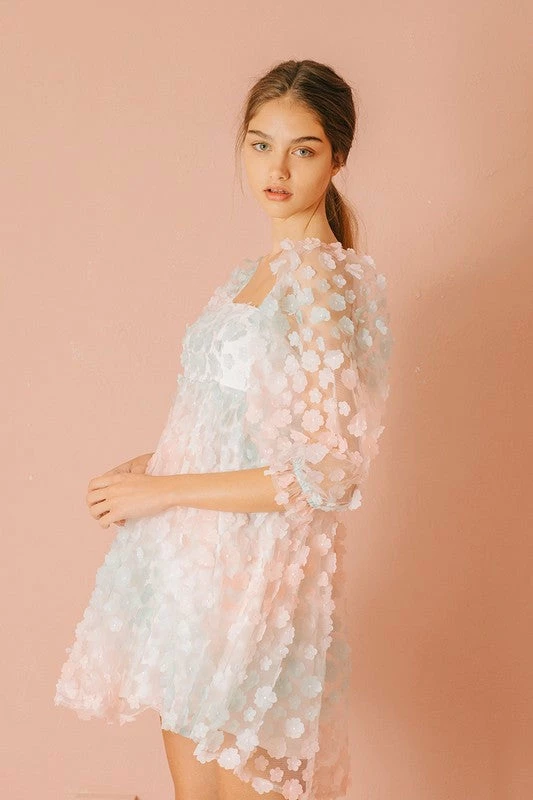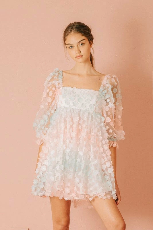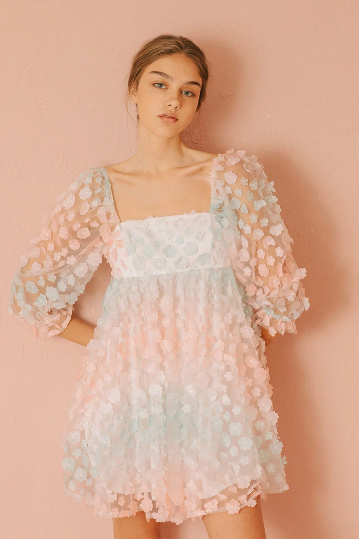 //Best Seller// Our She’s Like Spring Tulle Babydoll Dress comes in the cutest silhouette & fabrication! This tulle base and pastel floral 3D print dress has ¾ puff sleeves and a concealed back zip closure. The 3D daisy give it that much detail!