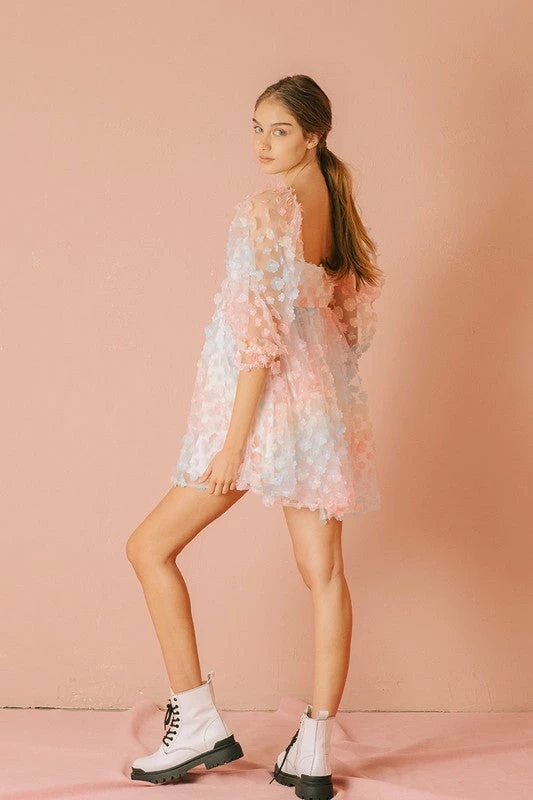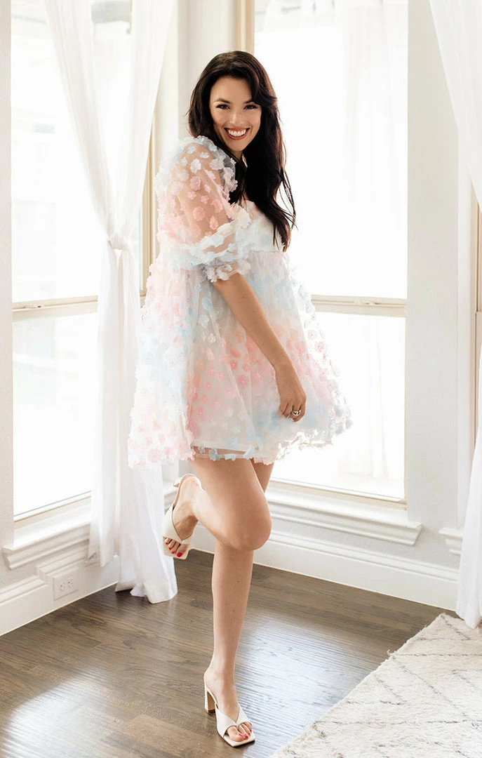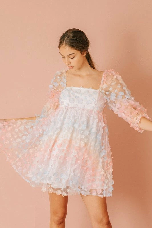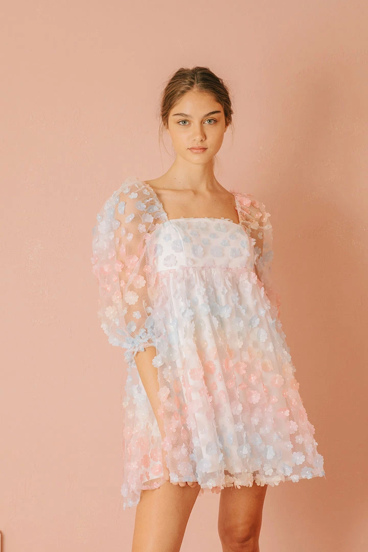 //Best Seller// Our She’s Like Spring Tulle Babydoll Dress comes in the cutest silhouette & fabrication! This tulle base and pastel floral 3D print dress has ¾ puff sleeves and a concealed back zip closure. The 3D daisy give it that much detail!