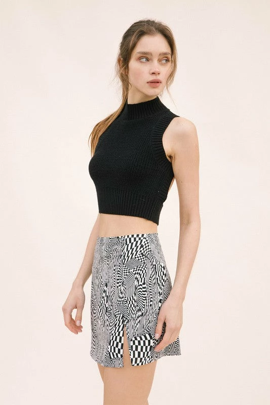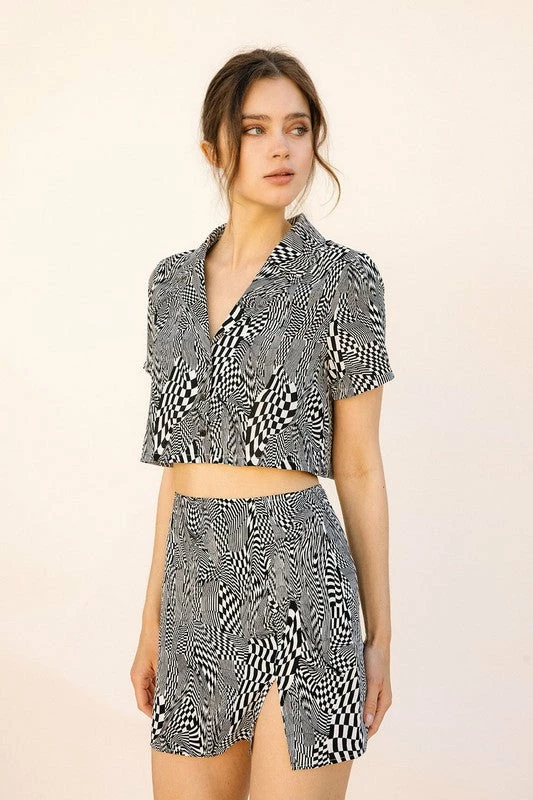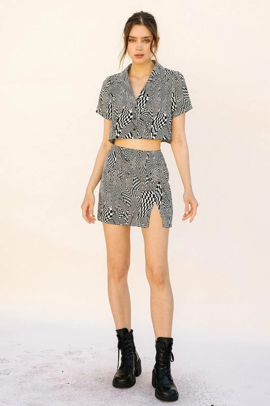 Our Swirled Checkered Mini Skirt is so flirty with a 5” side slit on the front! This skirt has a checkered swirl fabrication. Styled with the matching Swirled Button Down Crop Top.