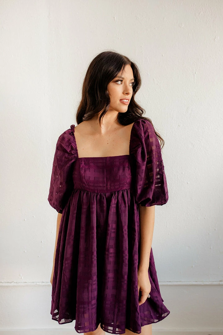 //Best Seller// Our Vicky High Sheen Babydoll Dress comes in a checkered print! This wine high sheen dress has ¾ puff sleeves and a concealed back zip closure.