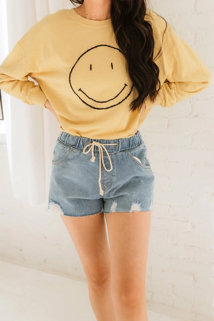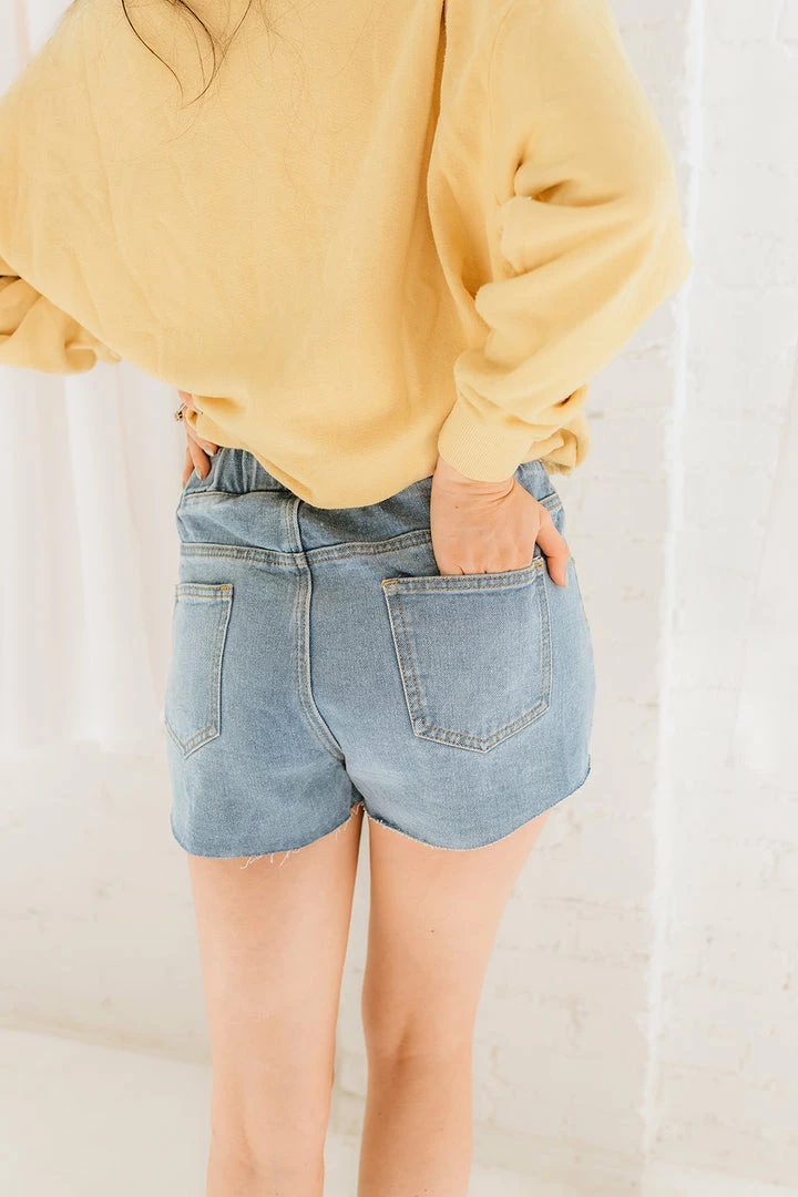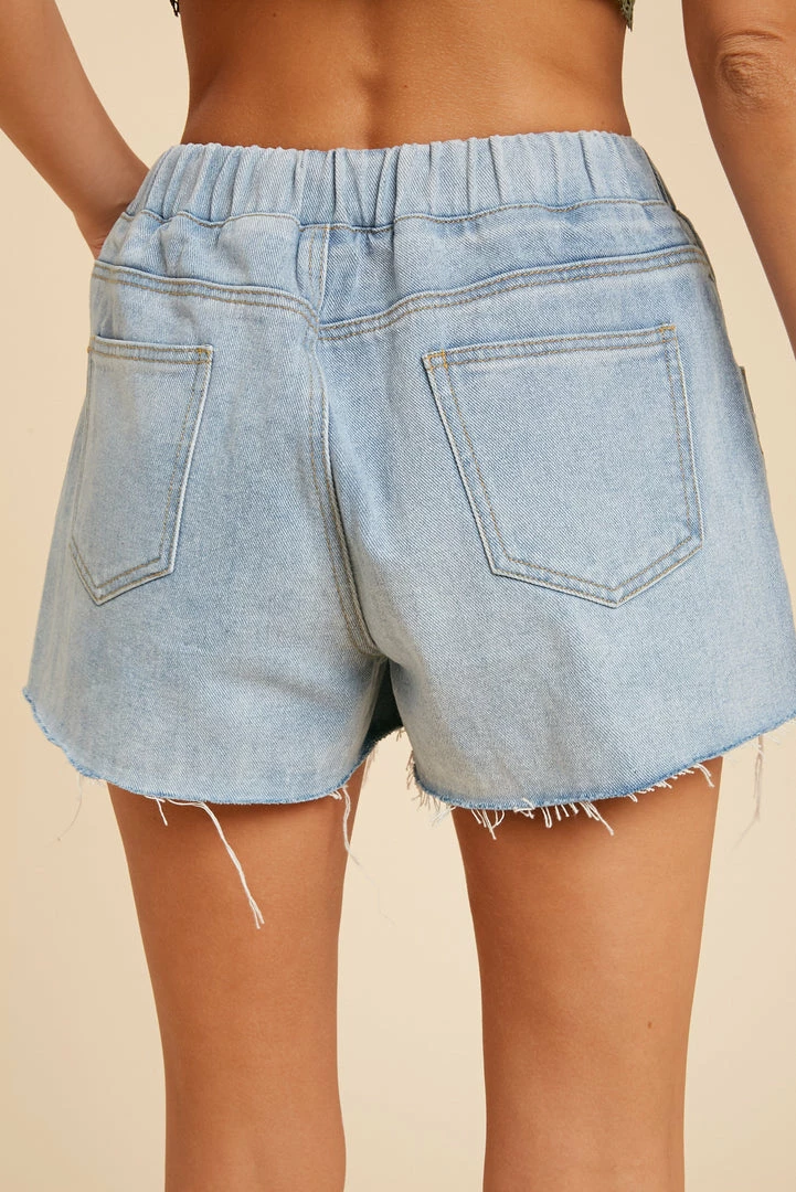 //WISHLIST Denim// The shorts you’ll be wearing all spring and summer long! Our Tilda Distressed Drawstring Denim Shorts are light wash with a high rise relaxed fit and an elastic drawstring waist finished with a frayed hem and 4 pockets.