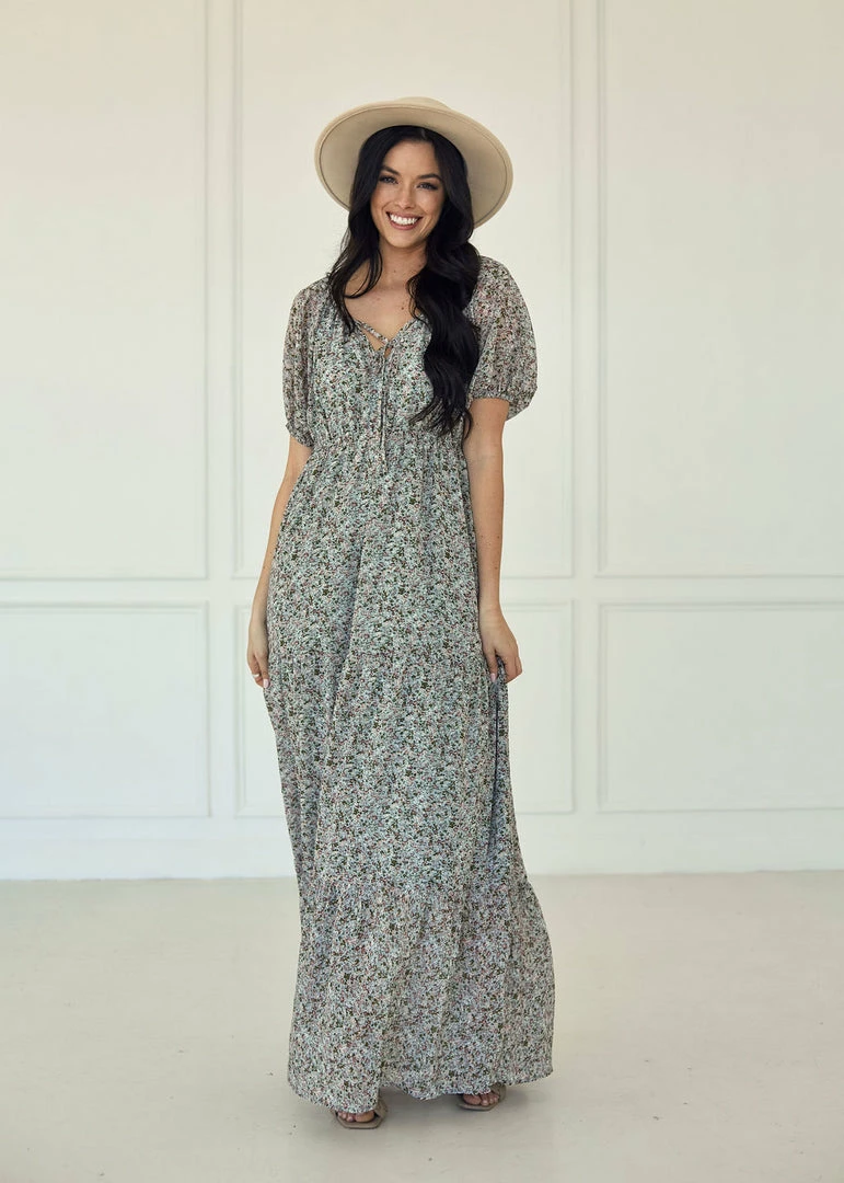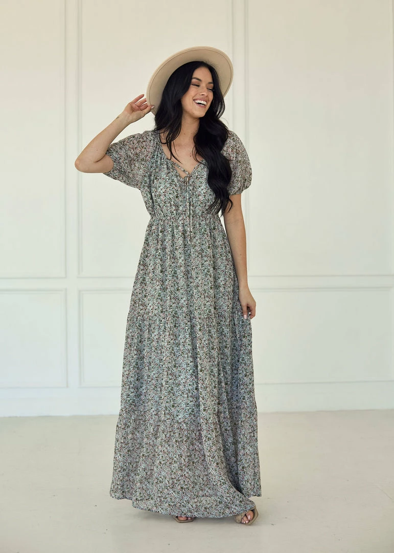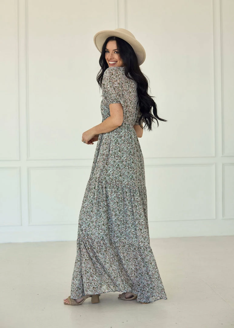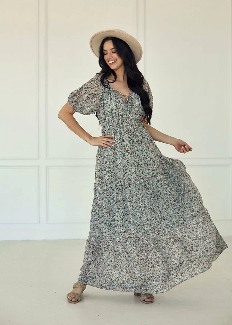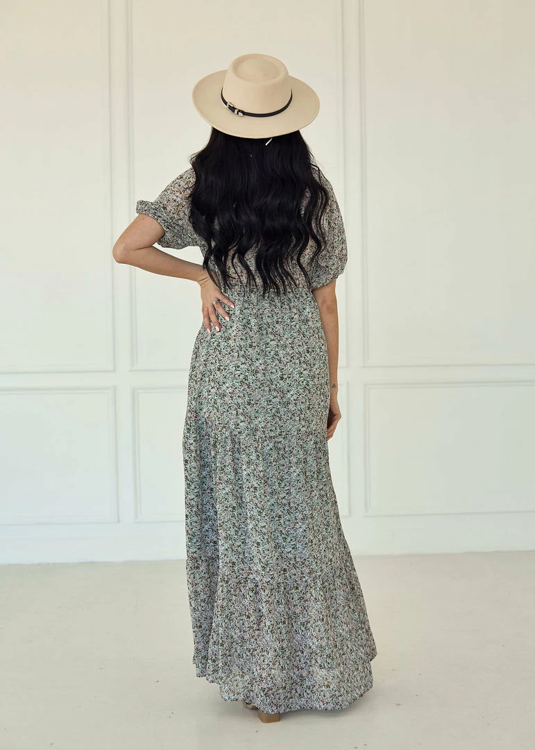 Visit the vineyards in our Ditsy Daisy Chiffon Tiered Maxi Dress! Sage, ivory, olive and blush florals decorate this tiered maxi. Finished with elastic shoulder so you can wear it on or off your shoulders.