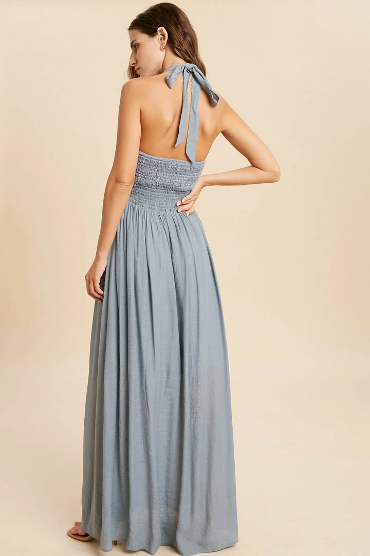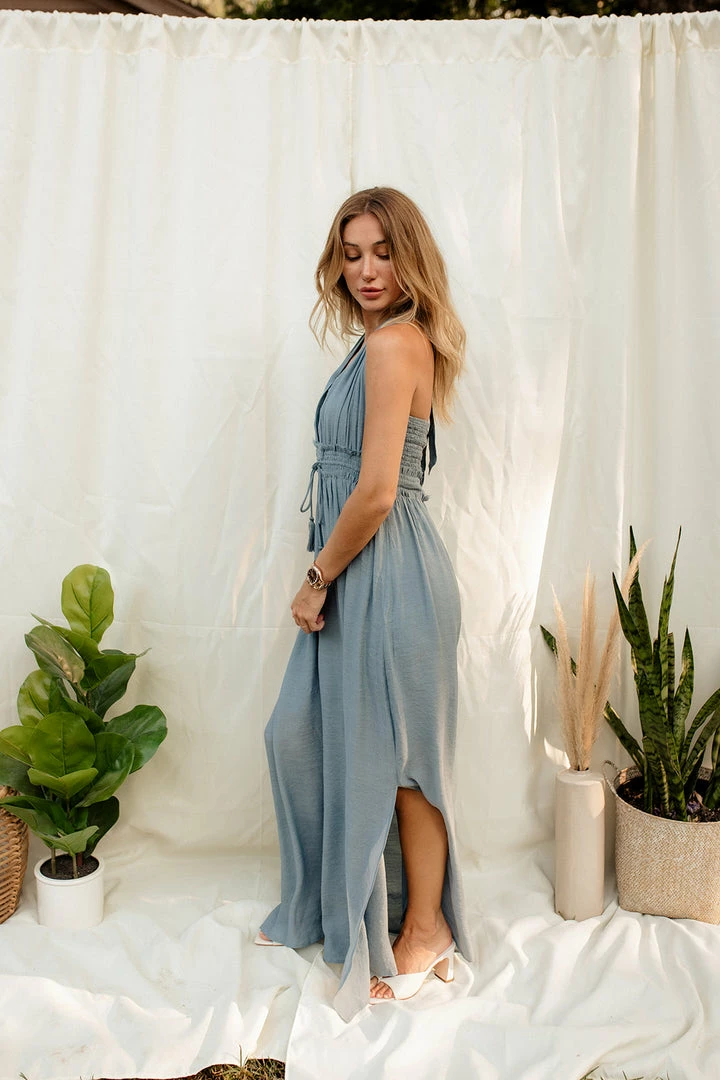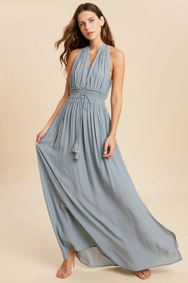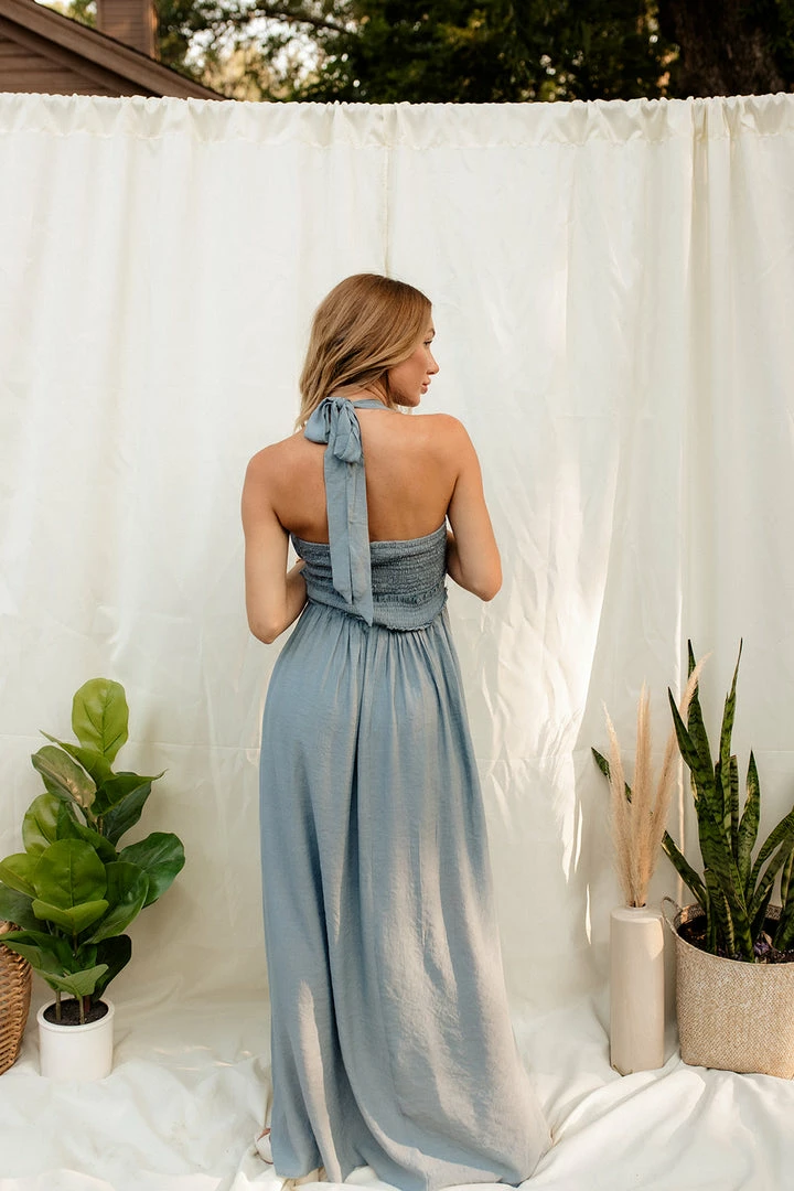 Our Kiera Smocked Halter Maxi Dress is uber flattering! This cloud halter maxi is crafted with a smocked bust and an adjustable halter necktie closure. Designed with a slit side & elastic tassel waist.