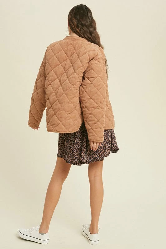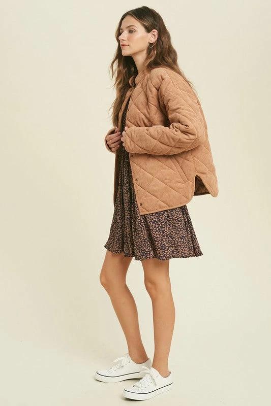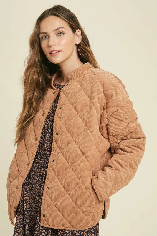 We’re all about novelty quilted fabrication this season! Our Mac Quilted Padded Corduroy Jacket comes in a mocha. Designed with side pockets and snap button closures.