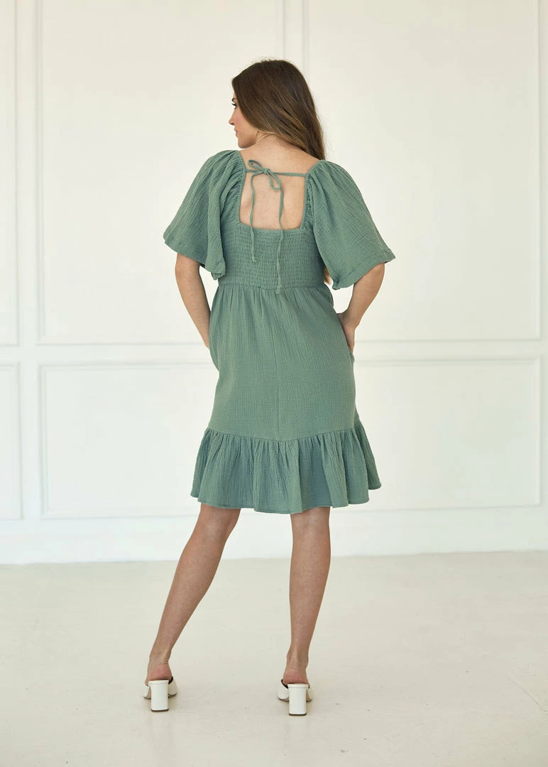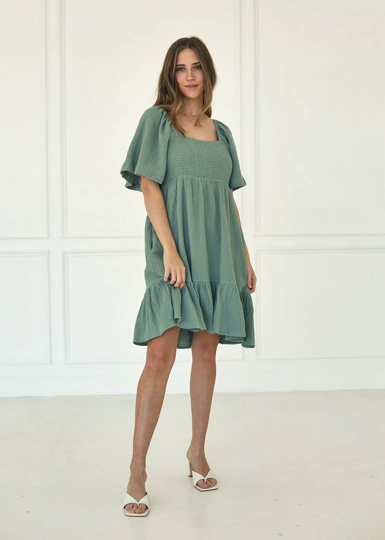 Our Nolani Flutter Sleeve Smocked Mini Dress is such an easy wear! This navy midi dress is designed with a square neckline and a smocked bust. The flutter sleeves provide femininity. Complete with a tie closure back.