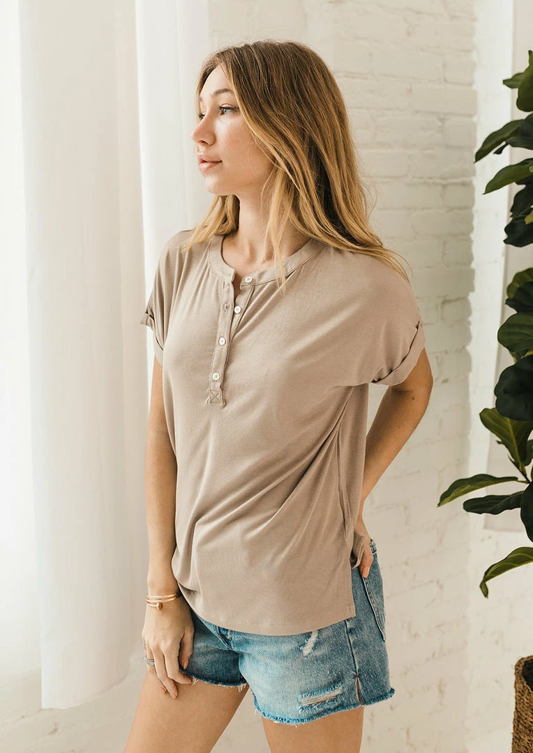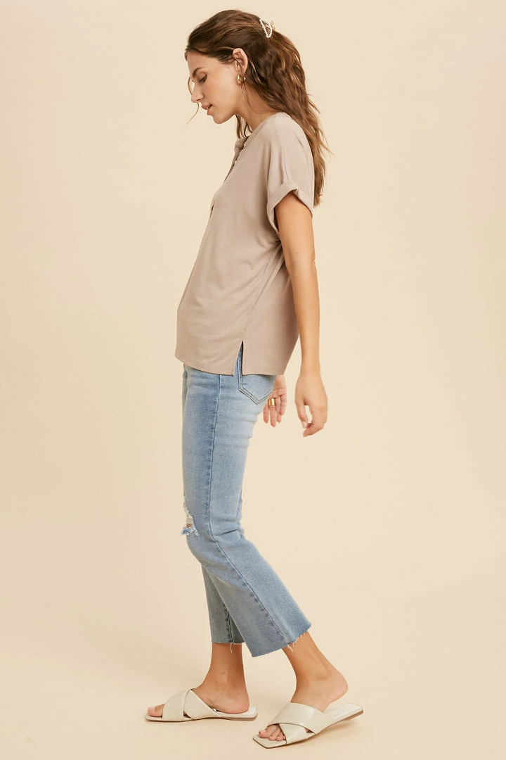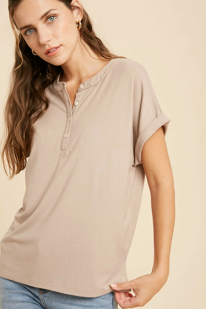 Our Sam Relaxed Knit Henley Tee keeps things cool and casual in its light sage hue and relaxed fit with sewn cuffed short sleeves. Finished with front henley button closures. An everyday essential!