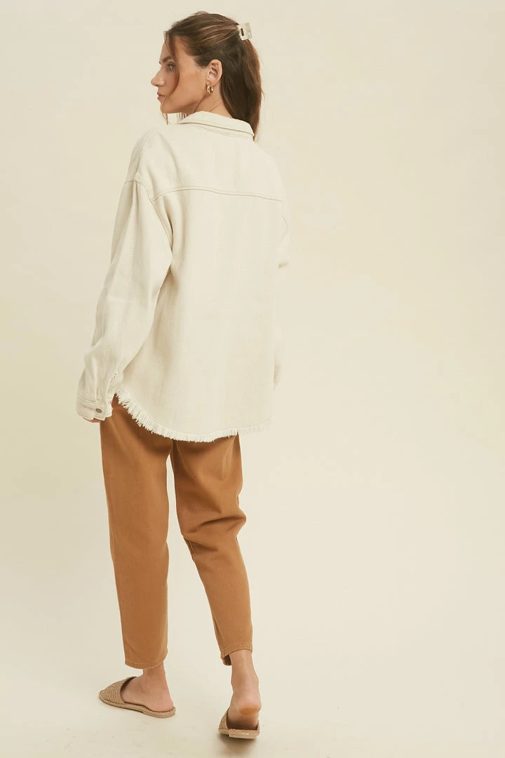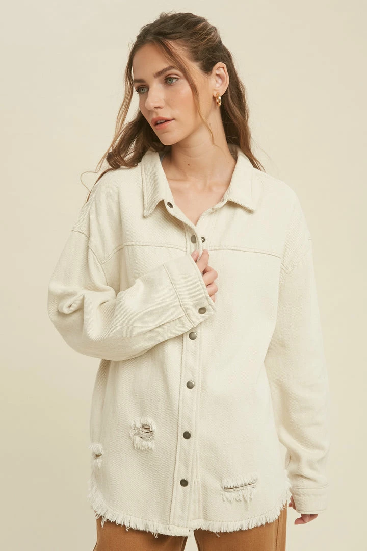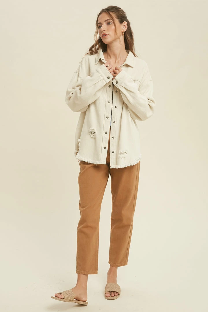 Upgrade your outerwear in our Well Worn Distressed Denim Jacket! This pretty ecru piece is designed with a collar and distressed details throughout. Finished with front button closures.